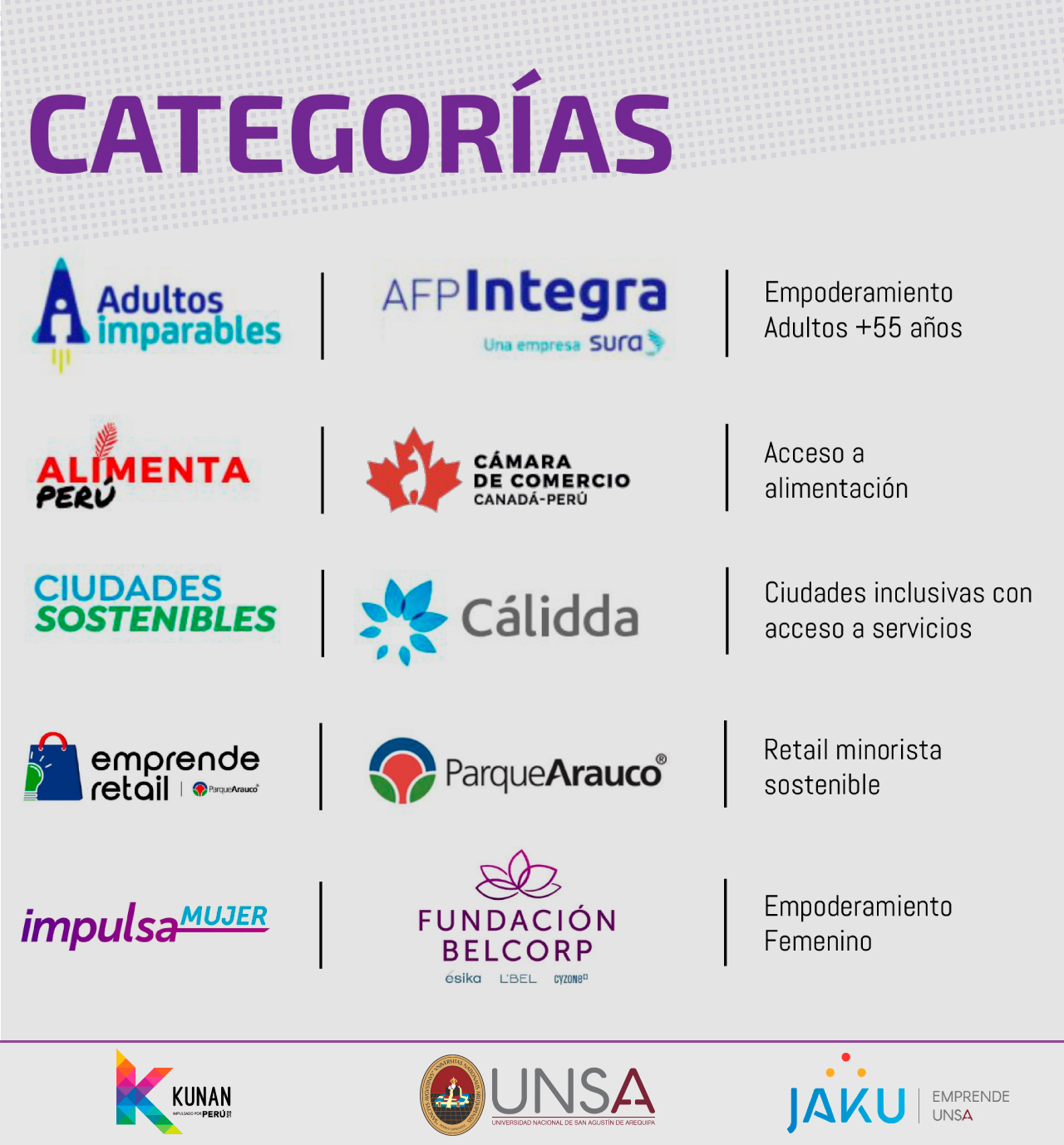 Tiene las categorías de ¡Impulsa Mujer, Alimenta Perú, Ciudades Sostenibles, Adultos Imparables y Emprende Retail.