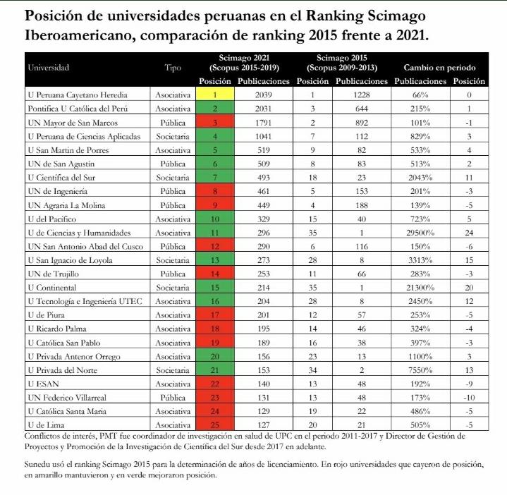 El primero lugar de la clasificación lo tienen la Universidad Peruana Cayetano Heredia, seguido de la Pontifica Universidad Católica del Perú, Universidad Nacional Mayor de San Marcos, Universidad Peruana de Ciencias Aplicadas y la Universidad San Martín de Porres, y la UNSA.