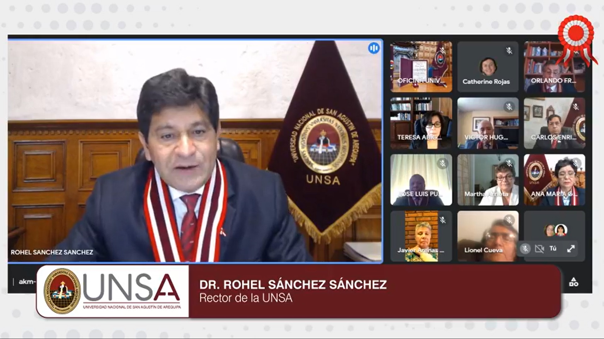 El rector de la UNSA, Dr. Rohel Sánchez, Sánchez, también dirigió algunas palabras para la catedrática, indicando el reconocimiento e incorporación es un acontecimiento importante por la destacada labor de la Dra. Teresa Arrieta.