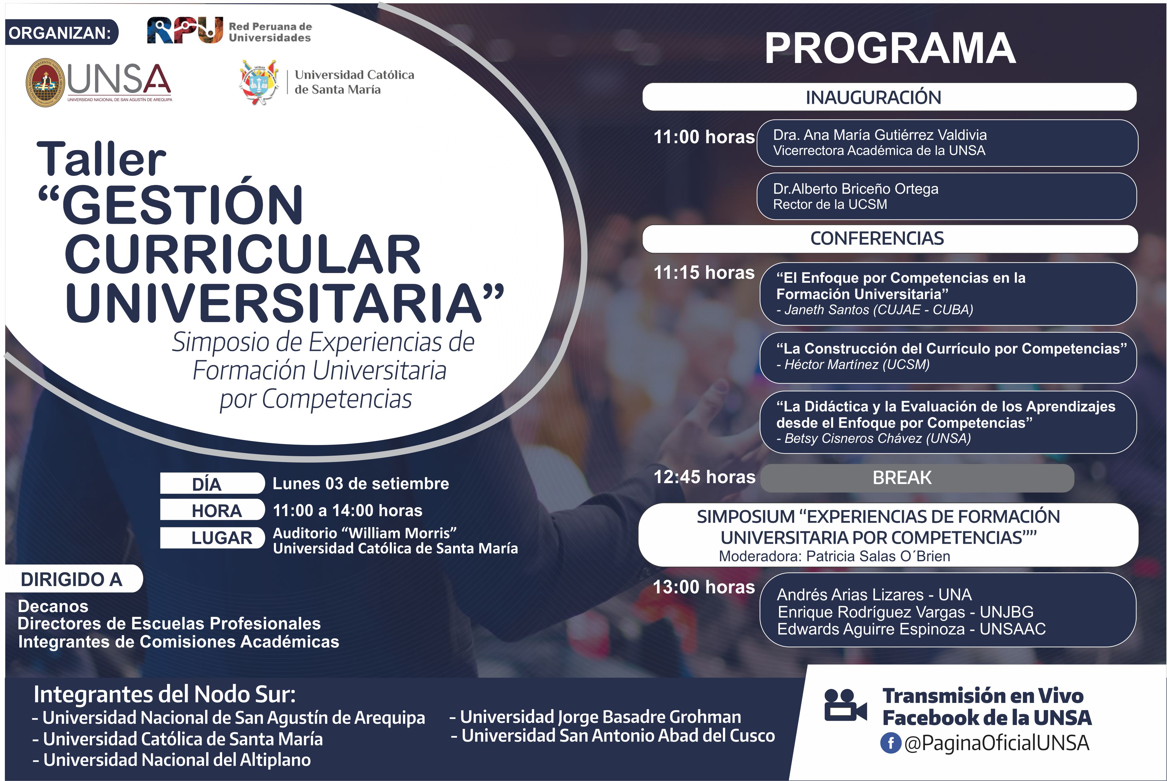 La Red Peruana de Universidades, junto a la Universidad Católica de Santa María y nuestra universidad, invita a las instituciones integrantes de su Nodo Sur, a asistir al Taller «Gestión Curricular Universitaria», Simposio de Experiencias de Formación Universitaria por Competencias, dirigido a Decanos, Directores de Escuelas e integrantes de Comisiones Académicas.