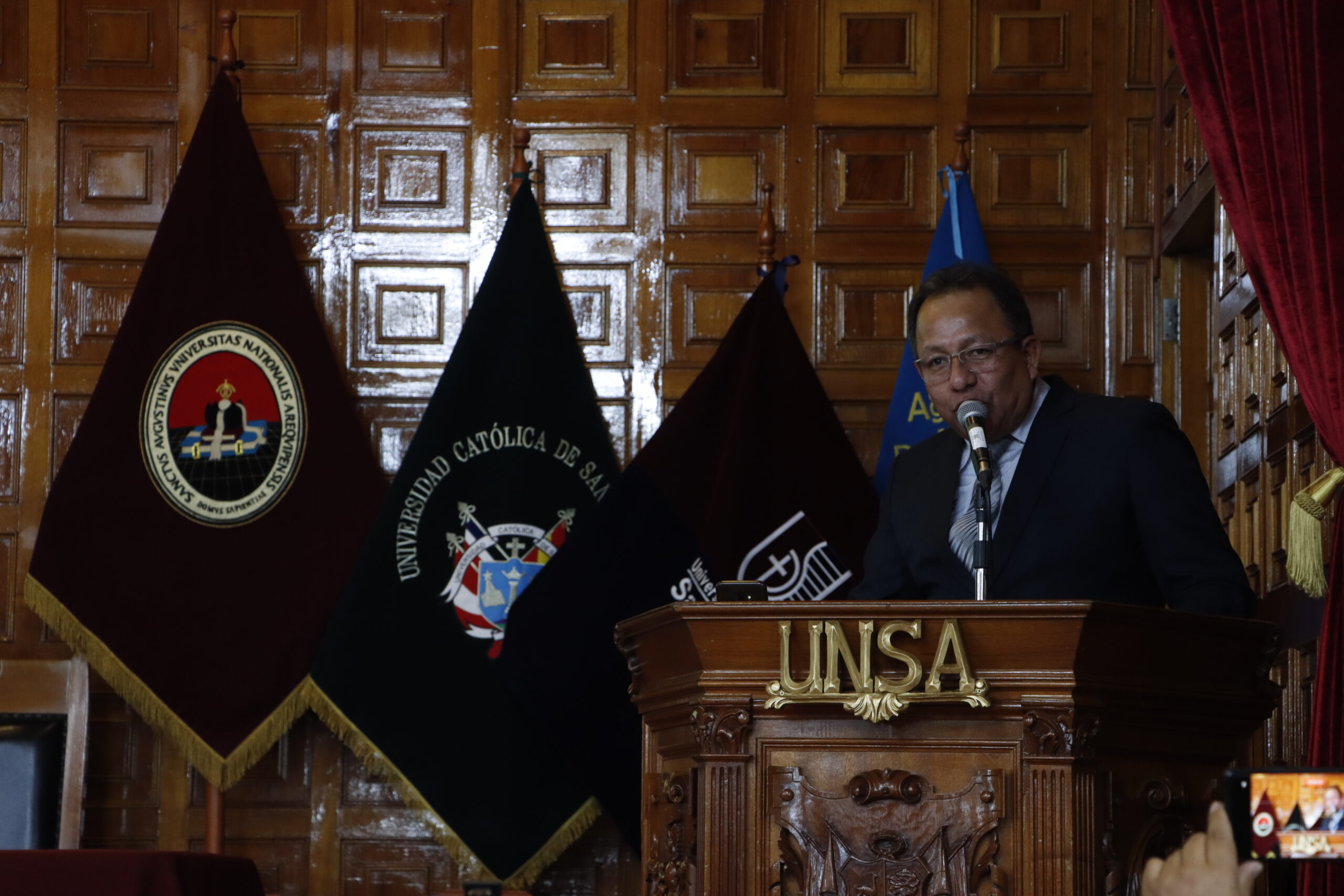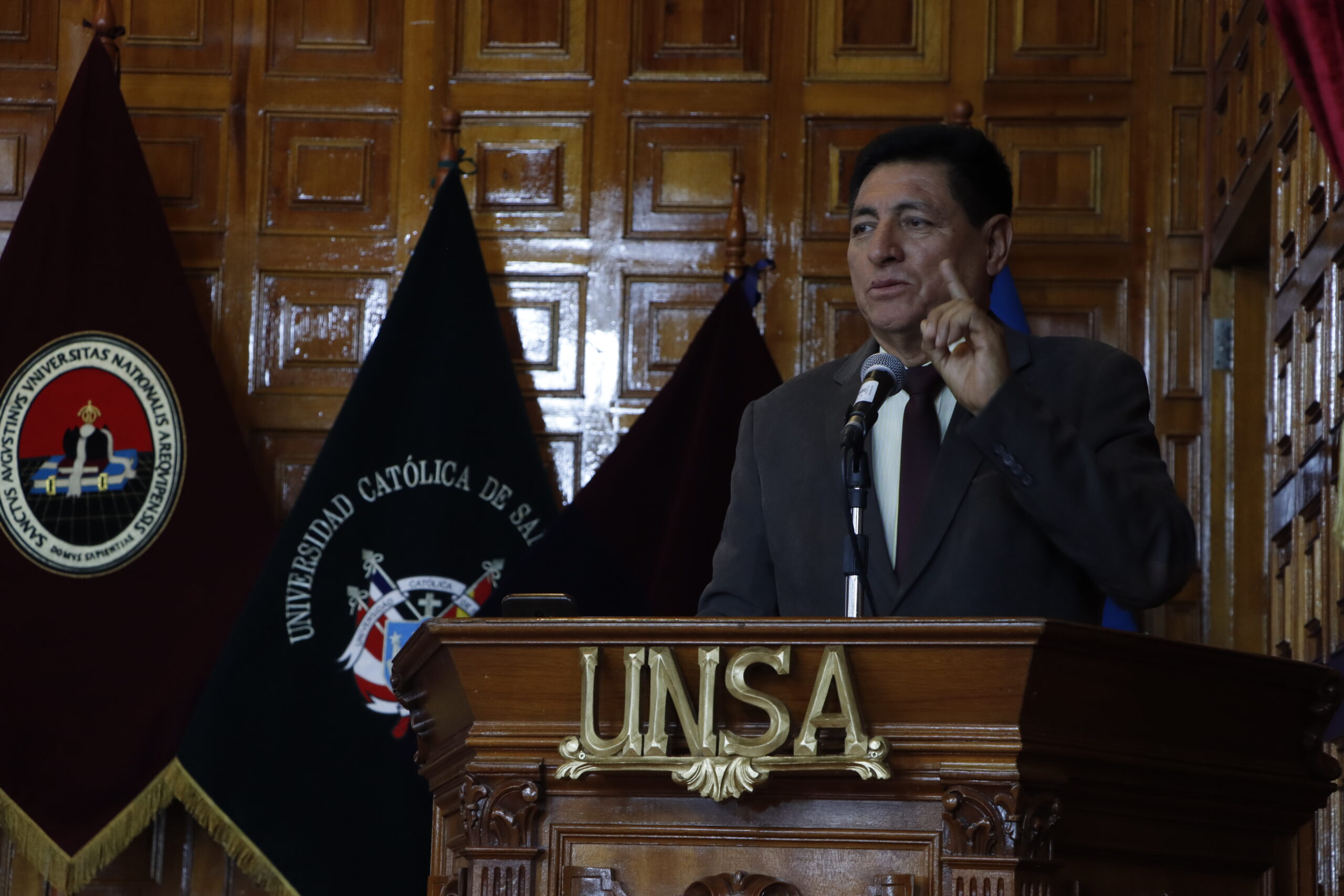 El encuentro se desarrolló en el Paraninfo Arequipa de la Universidad Nacional de San Agustín de Arequipa (UNSA), con la participación del rector, Dr. Hugo Rojas Flores, quien dio las palabras de bienvenida, además de solicitar reforzar la seguridad en los campus universitarios para garantizar el bienestar de la comunidad estudiantil y el correcto actuar de los agentes del orden en base a la proporcionalidad de la fuerza. Estuvo acompañada por la secretaria general de la Universidad, Dra. Ruth Maritza Chirinos Lazo.
