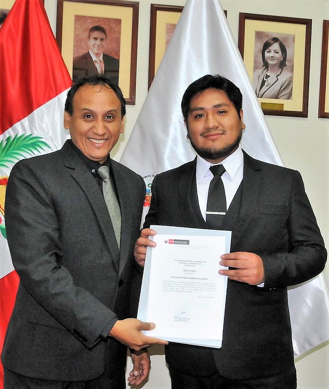 Patiño Roque, obtuvo el segundo lugar en la categoría estudiantes con el ensayo “¿Son eficaces los mecanismos legales de protección que propone el Estado para proteger a las víctimas que sufren actos de violencia familiar?”, mientras que Mamani Cusiatau, también obtuvo el segundo lugar en la categoría egresados con el ensayo “La necesidad de un control ex ante, en la voluntad de los padres para elegir el pre nombre de sus hijos”.