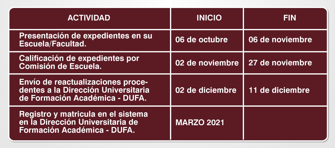 Explicó que se conformaran comisiones para la calificación de expedientes en las Escuelas Profesionales y Facultades, esta tarea se realizará del 02 al 27 de noviembre, los mismos que una vez aprobados serán enviados a la Dirección Universitaria de Formación Académica – DUFA del 02 al 11 de diciembre.