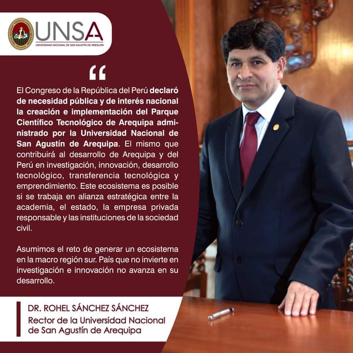 El rector de la UNSA, Dr. Rohel Sánchez Sánchez, destacó que el Parque Científico Tecnológico de Arequipa será el aporte de la casa de estudios agustina al avance del país en investigación, innovación, desarrollo, emprendimiento y transferencia tecnológica.”Asumimos el reto de generar un ecosistema en la Macro Región Sur y ser referente en Latinoamérica en ciencias de la sostenibilidad, minería sostenible, salud pública y ciencias atmosféricas”, explicó.