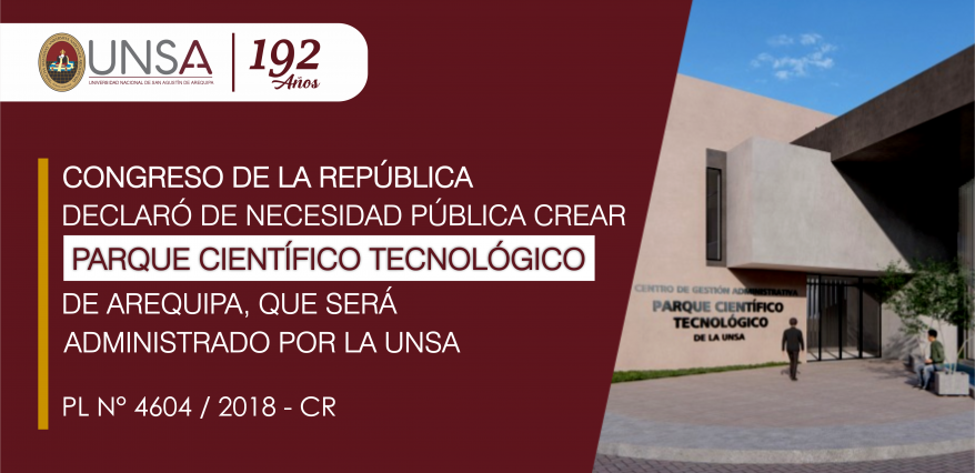 El Pleno del Congreso aprobó en segunda votación por unanimidad la ley que declara de necesidad pública y de interés nacional la creación del Parque Científico Tecnológico de Arequipa, el primero del país, que estará bajo la administración de la Universidad Nacional San Agustín de Arequipa (UNSA).