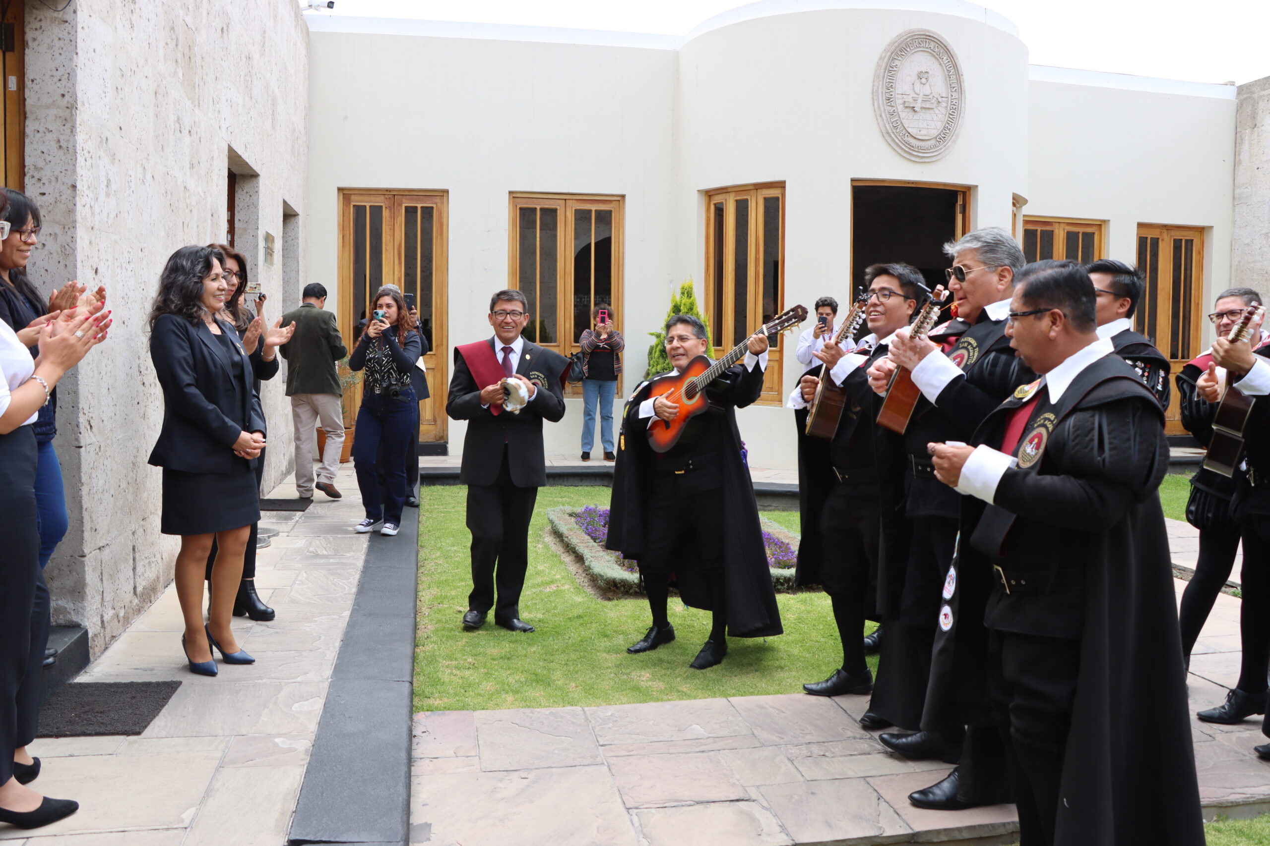 Los Antiguos Tunos recorrieron las oficinas administrativas del Rectorado para saludar a las autoridades agustinas y ofrecer un breve espectáculo en sus patios. Dieron un breve homenaje a su alma mater con cantos e instrumentos musicales.