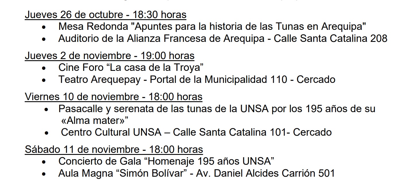 Las presentaciones iniciarán desde el jueves 26 de octubre con la Mesa redonda “Apuntes para la historia de las Tunas en Arequipa”, Alianza Francesa de Arequipa (calle Santa Catalina 208) y la proyección de la película “La casa de la Troya” en el Teatro Arequepay el dos de noviembre.