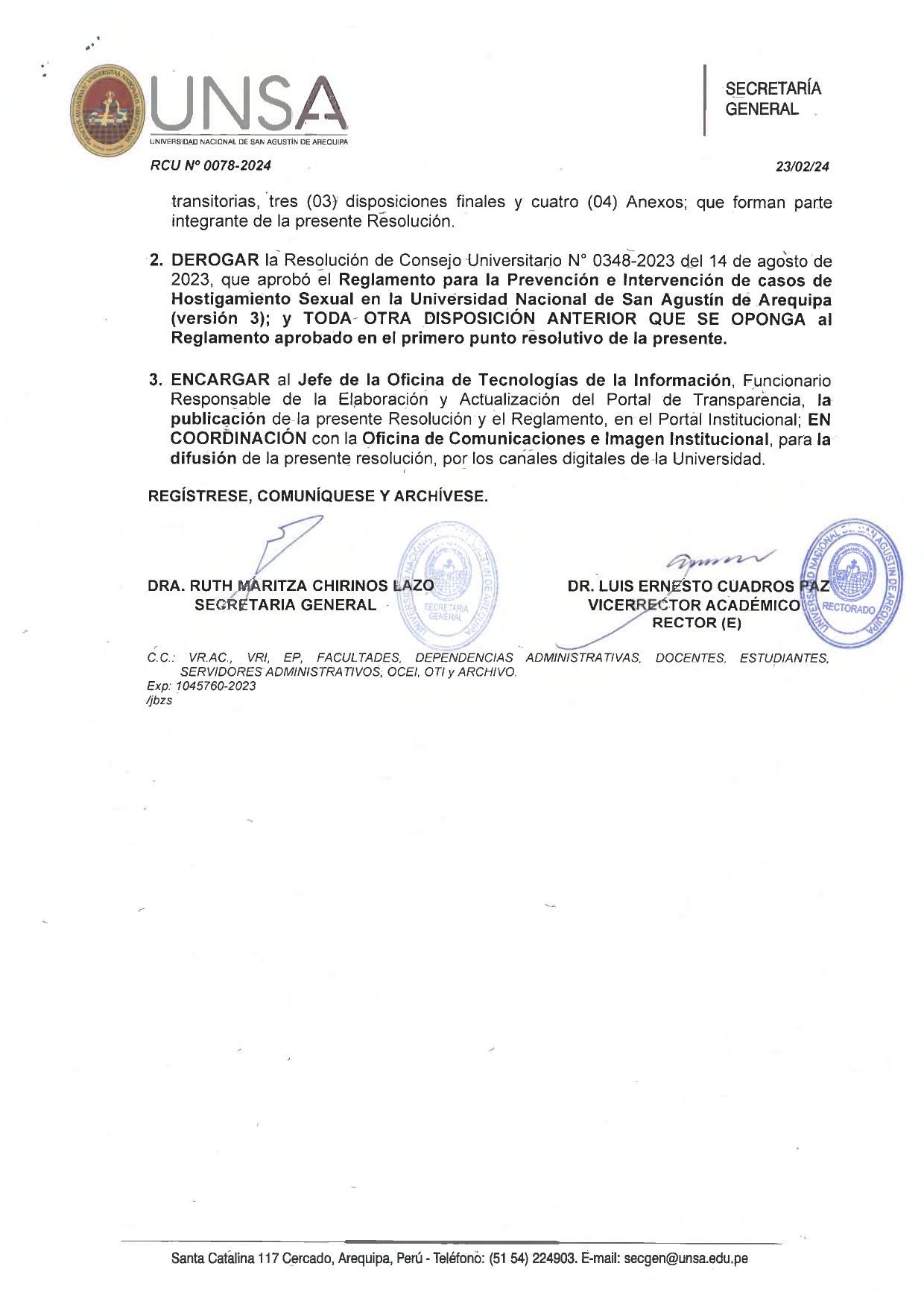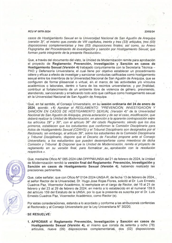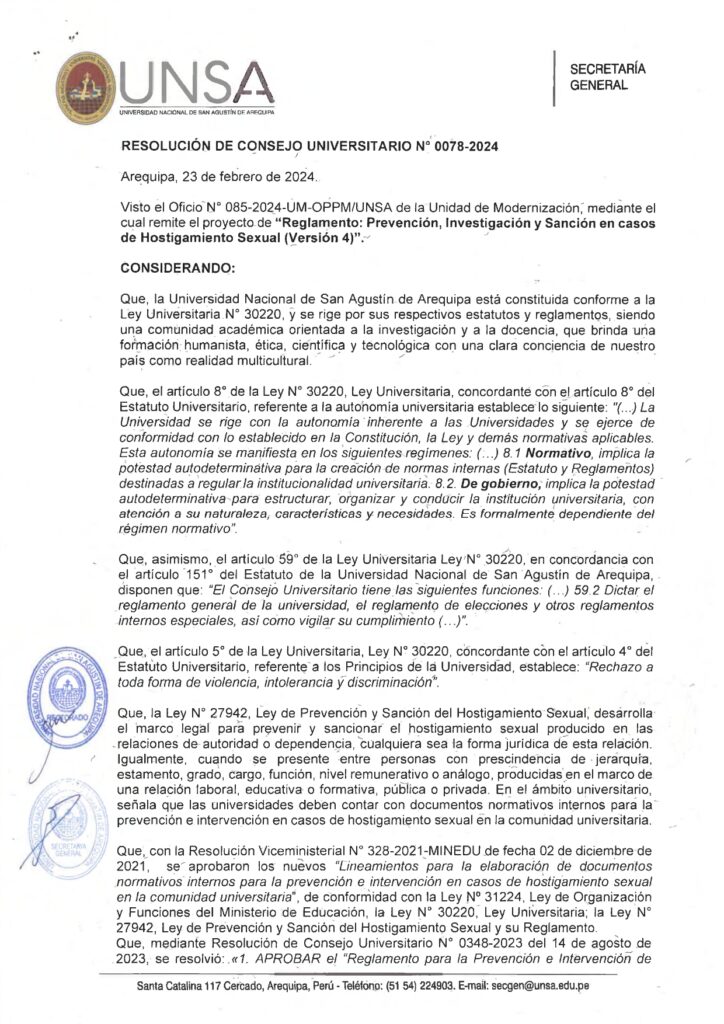 Resolución de Consejo Universitario N° 0078-2024 «Reglamento: Prevención, Investigación y Sanción en casos de Hostigamiento Sexual»