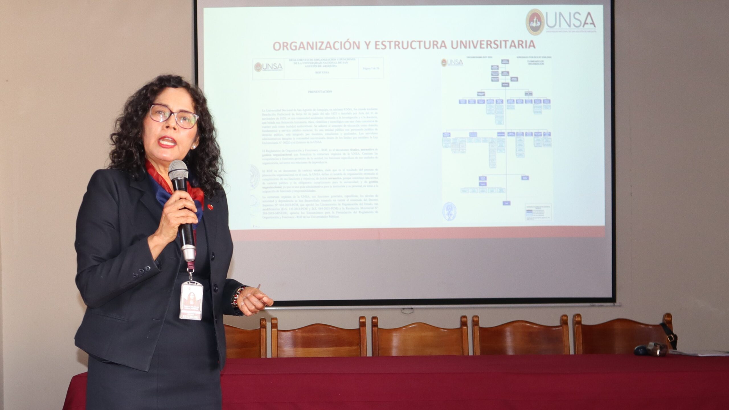 La capacitación comenzó con la presentación de la Ing. Gissela Zúñiga Moreno, especialista administrativa de la Unidad de Modernización, quien expuso sobre la visión, misión, valores, objetivos y políticas de la UNSA. El abogado Guillermo González también formó parte de la capacitación, abordando las principales normas que regulan el funcionamiento de las universidades y los usos comunes de siglas.