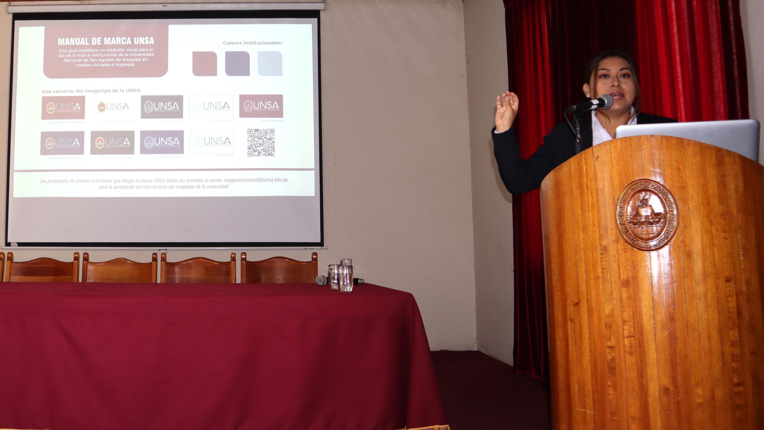 Las licenciadas Yoselin Condemayta Coila y Verónica Pino Hidalgo, especialistas en marketing de la Oficina de Comunicación e Imagen Institucional, ofrecieron información sobre la marca UNSA, así como una guía para el formato de documentación y el diseño de sellos virtuales y físicos.
