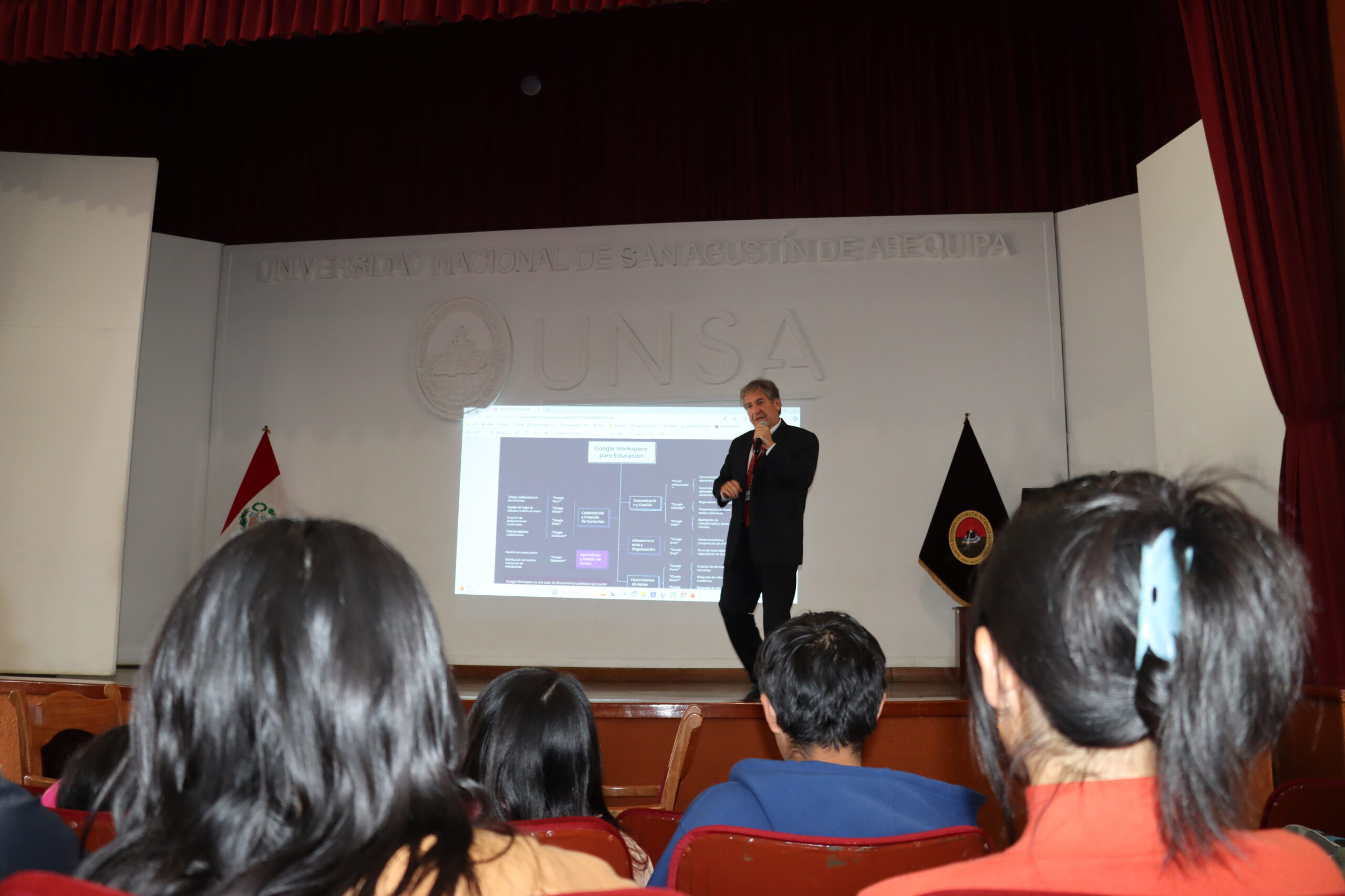 Los estudiantes de primer año de la Universidad Nacional de San Agustín de Arequipa (UNSA) recibieron charlas de inducción por parte de la Oficina de Tecnologías de la Información (OTI), para familiarizarlos con los recursos digitales de la universidad para su beneficio. Las sesiones se realizaron en dos fechas en el Aula Magna Simón Bolívar.