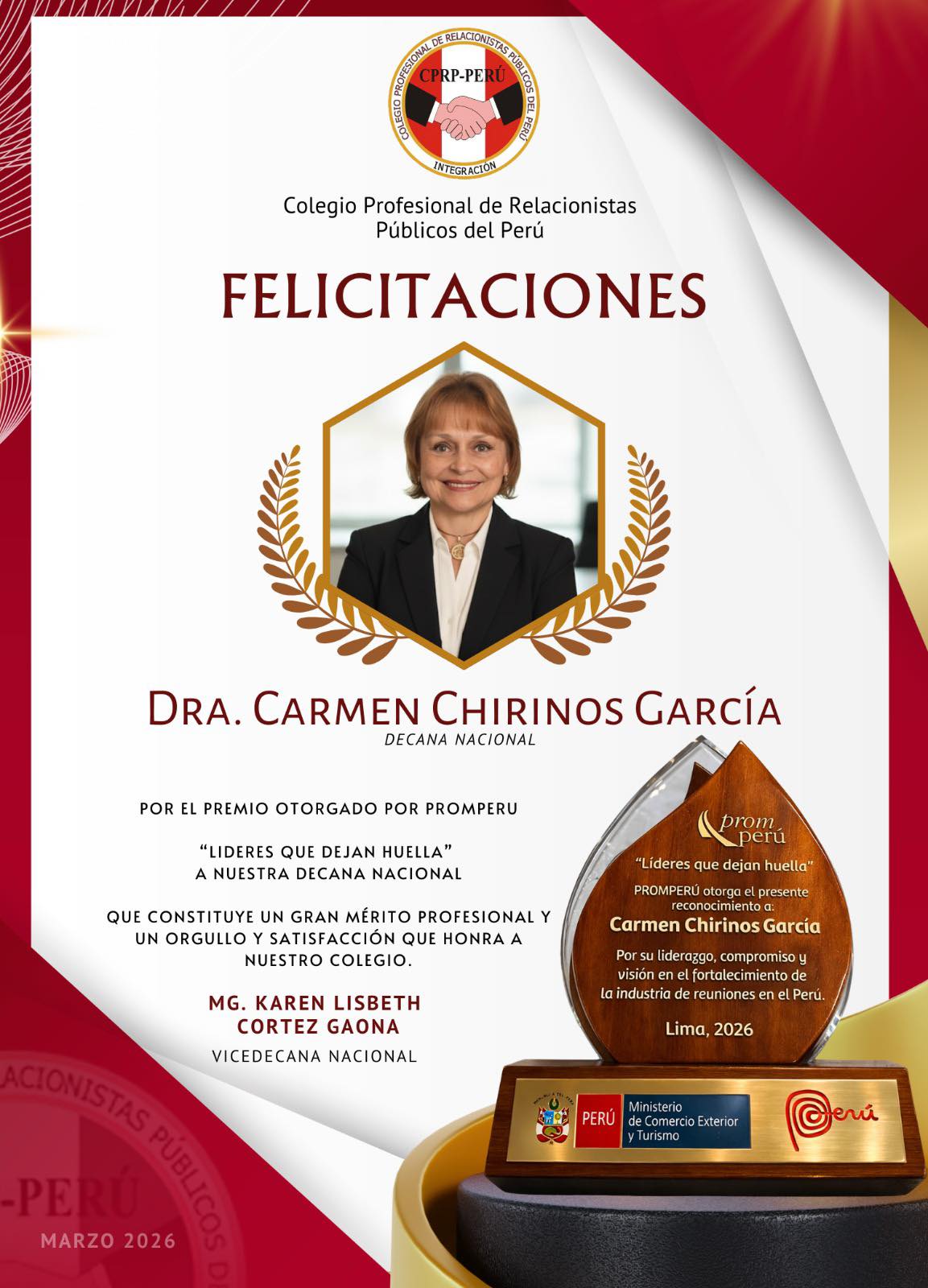 La académica arequipeña Carmen Chirinos García, docente de la Escuela Profesional de Ciencias de la Comunicación de la Universidad Nacional de San Agustín de Arequipa (UNSA), fue distinguida con el reconocimiento “Líderes que dejan huella”, un galardón que destaca a los profesionales que impulsan el posicionamiento del Perú como sede de grandes eventos internacionales. El reconocimiento subraya su trayectoria, liderazgo institucional y aporte al desarrollo de la comunicación y las relaciones públicas en el país.