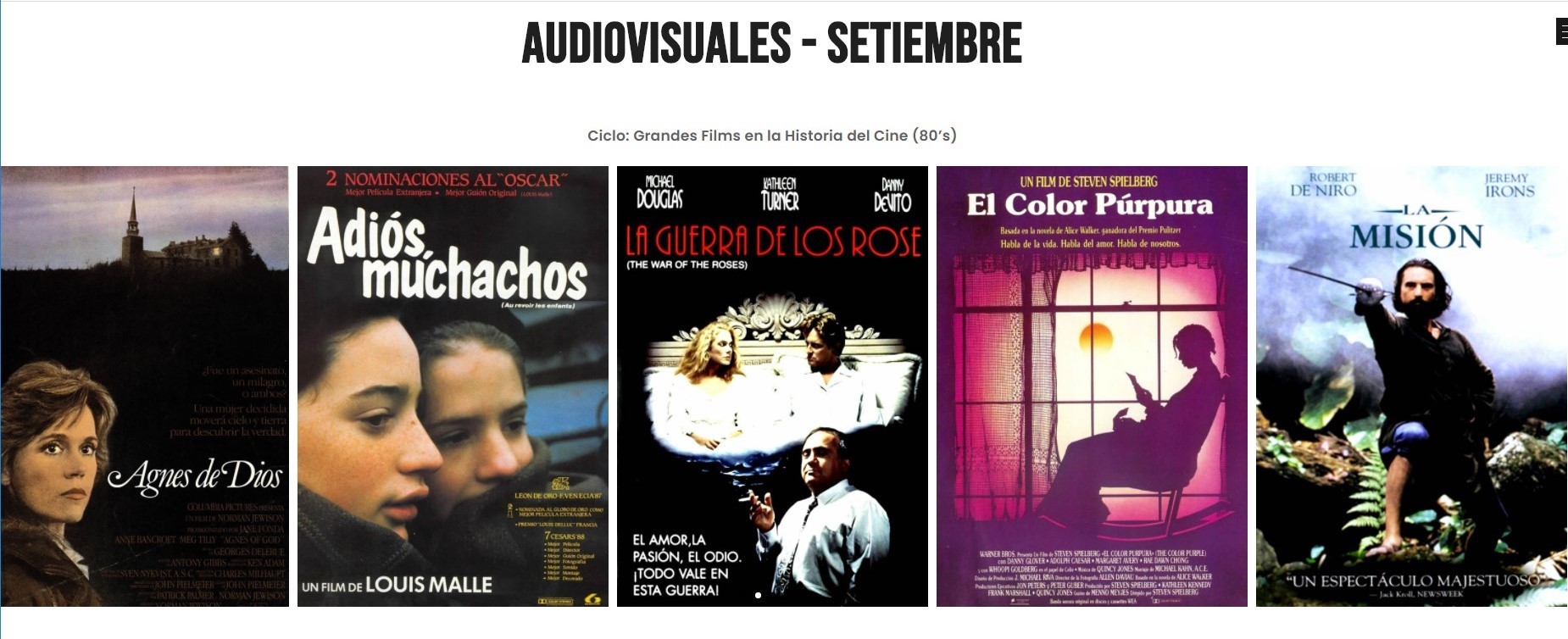 Además, presenta Audiovisuales – Septiembre con su renovada cartelera, Ciclo: Grandes Films en la historia del Cine de los años 80, con películas como: Agnes de Dios, El Color Púrpura, El Imperio del Sol, Los Inmortales, entre otros que se convierte en una de las mejores opciones para los cinéfilos de nuestra ciudad y del mundo.