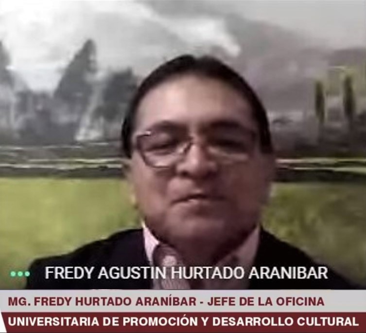 En esta significativa inauguración no pudo faltar la participación del Mg. Fredy Hurtado Araníbar, Jefe de la Oficina Universitaria de Promoción y Desarrollo Cultural, que organiza y coordina las actividades artísticas de la Casa Agustina, que dio la bienvenida a los maestros que se suman al reto virtual con sus mejores trabajos.