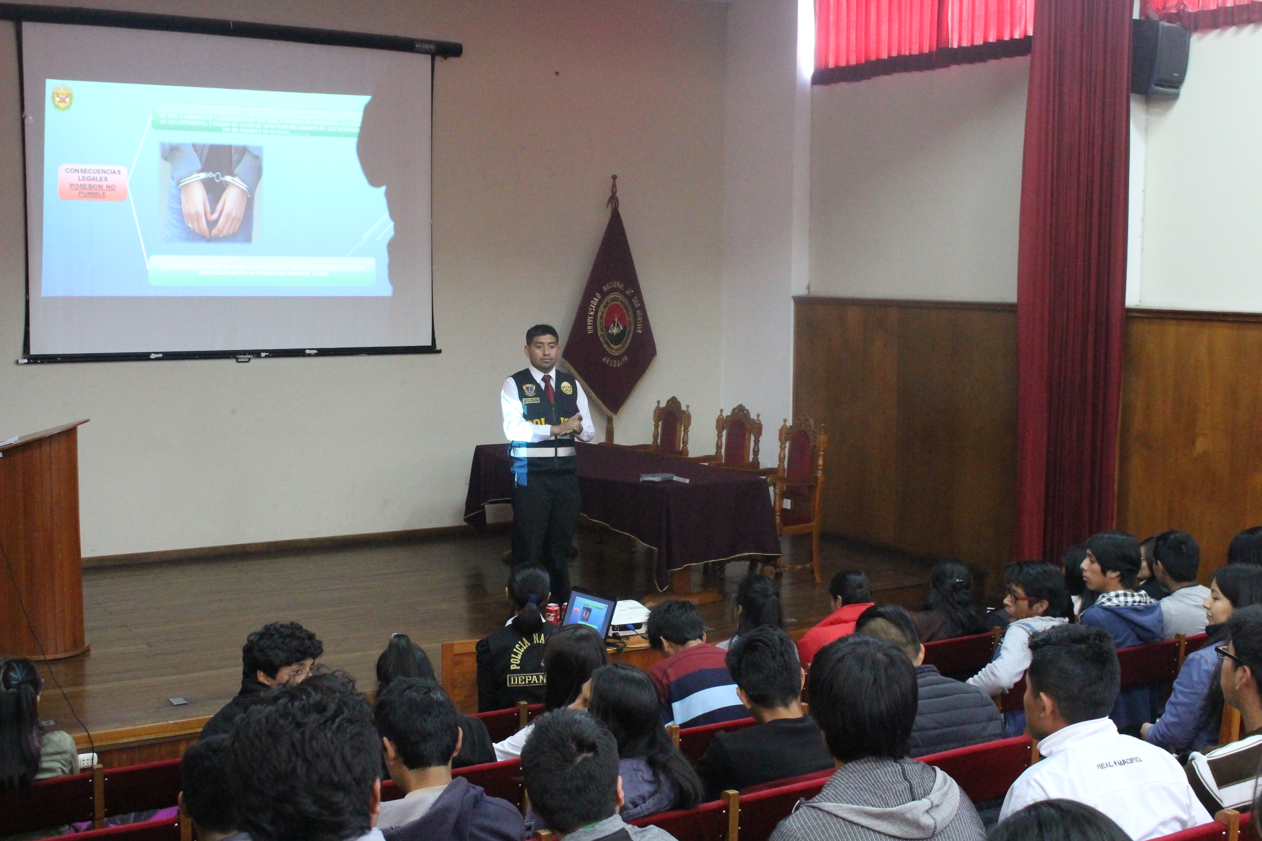 Con la finalidad de prevenir el consumo de drogas y otras sustancias tóxicas, la Oficina de Responsabilidad Social de la Facultad de Ciencias de la Educación en coordinación con la Oficina Universitaria de Responsabilidad Social de la Universidad Nacional de San Agustín de Arequipa, realizaron la charla “Microcomercialización de Drogas, consumo y consecuencias”, a cargo del Teniente PNP Ernesto Casillas Peñares, Jefe del Área Antidrogas de la Policía Nacional del Perú y la Sub Oficial PNP Regina Mendoza Cuyo, quienes expusieron las consecuencias penales, legales, de salud, violencia y demás, que provoca el uso y abuso de estas sustancias nocivas.