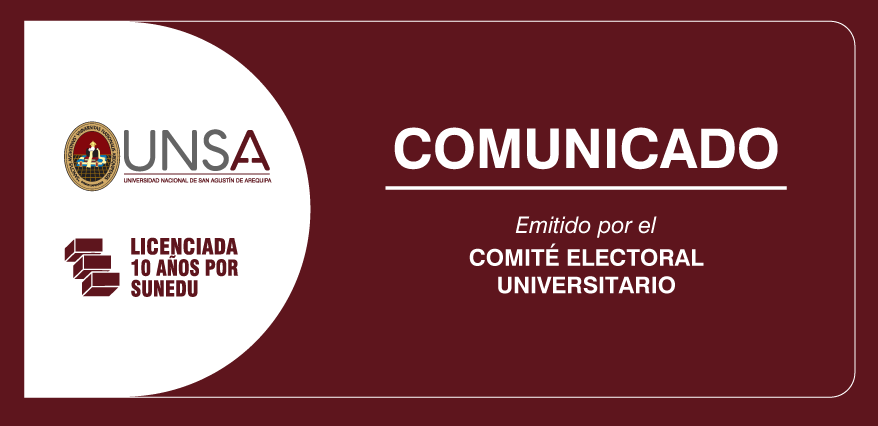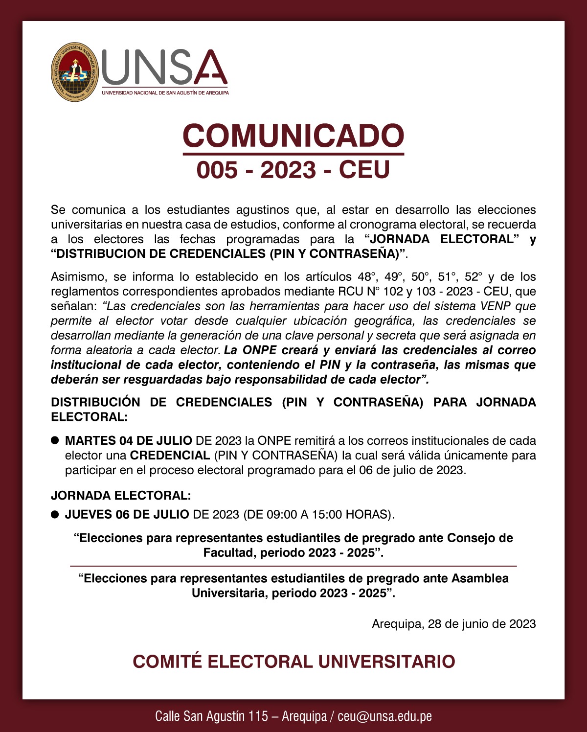 El Comité Electoral Universitario pone en conocimiento de la comunidad agustina las fechas del próximo sufragio para elegir a los representantes estudiantiles de pregrado ante el Consejo de Facultad, periodo 2023 – 2025 y los procedimientos para la entrega de credenciales, según lo establecen los reglamentos aprobados mediante la RCU – 102 y 103 -2023 – CEU.