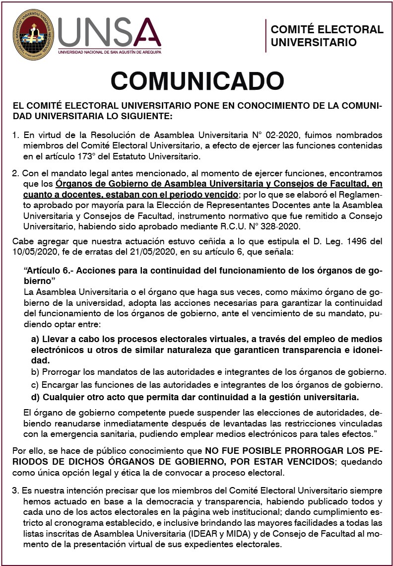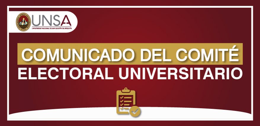 El Comité Electoral Universitario – CEU de la Universidad Nacional de San Agustín de Arequipa, que preside el Arq. Edgar Javier Arévalo del Carpio, emitió el siguiente COMUNICADO: