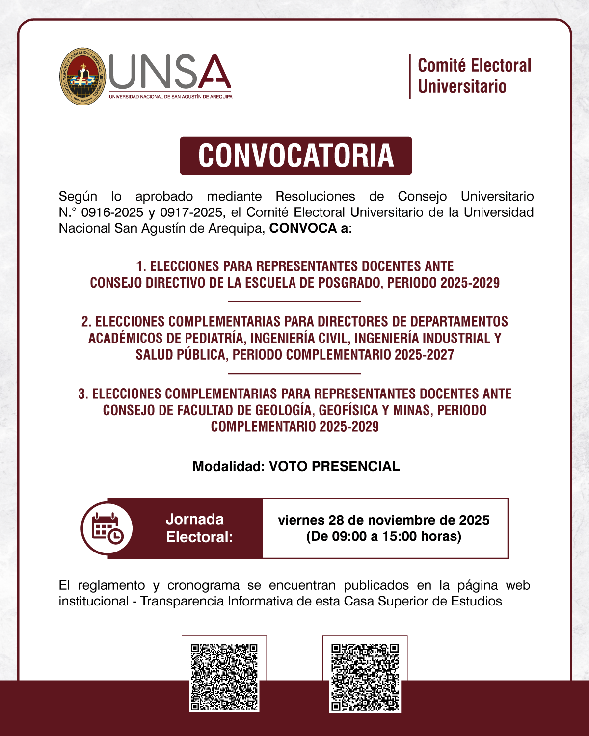 | Convocatoria a Elecciones Complementarias para Representantes Docentes ante Consejo de Facultad de Geología, Geofísica y Minas, Periodo Complementario 2025-2029 | Ver o Descargar |