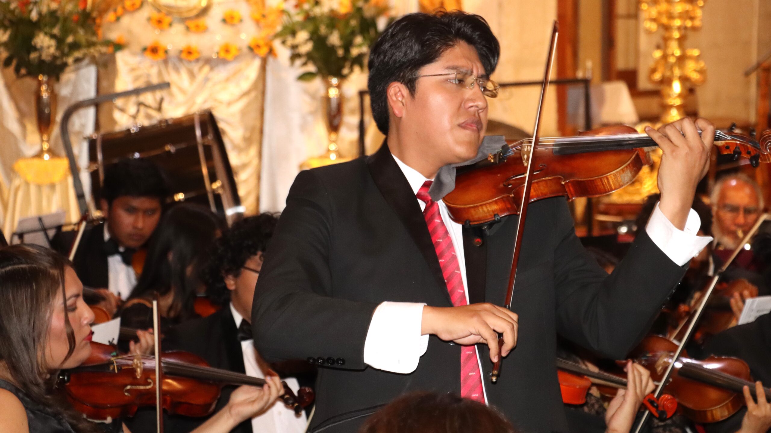 Bajo la dirección de la Maestra Pilar Lopera Quintanilla, el evento brindó a los asistentes una experiencia musical inolvidable, dividida en tres partes. En la primera, se presentó el «Concierto para violín y orquesta número 2 en re menor», donde el solista William Salazar Tarqui deslumbró con su interpretación de los movimientos «Allegro» y «Romance», acompañado magistralmente por la orquesta, creando un ambiente sonoro cautivador.