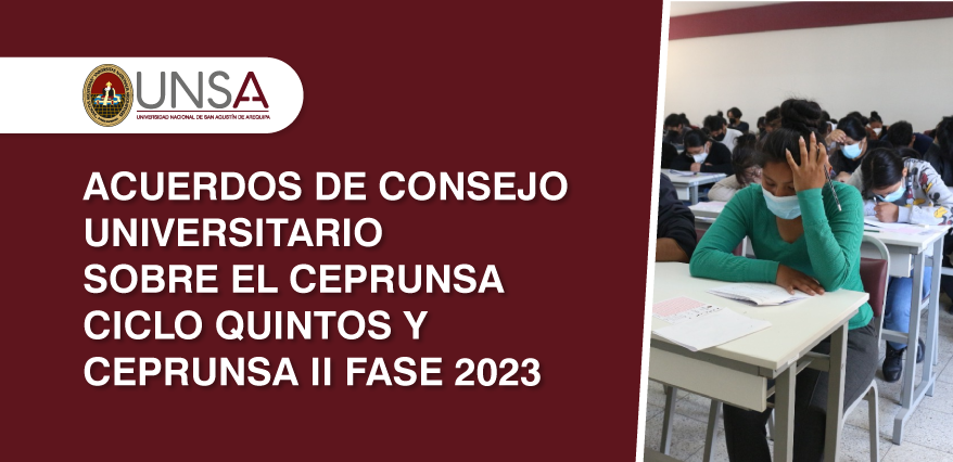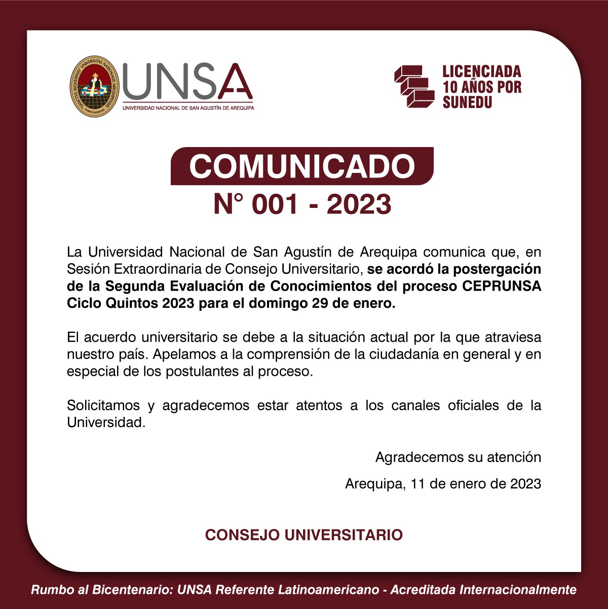 Durante una Sesión Extraordinaria de Consejo Universitario llevada acabo el miércoles 11 de enero, las autoridades de la Universidad Nacional de San Agustín de Arequipa acordaron postergar la segunda evaluación de conocimientos del CEPRUNSA Ciclo Quintos 2023 programado para el 15 de enero, siendo la nueva fecha del examen el 29 de enero.
