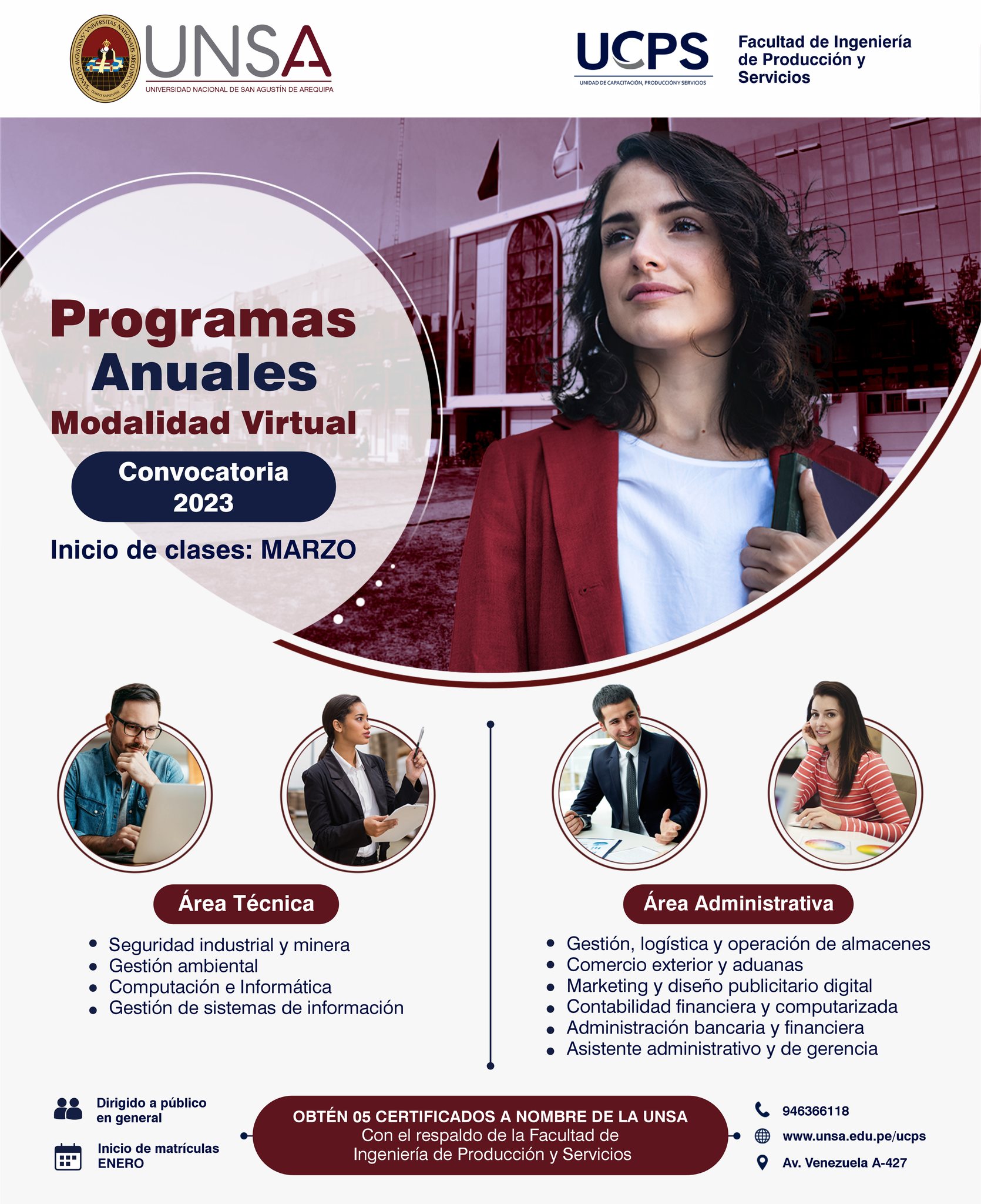 La Unidad de Capacitación, Producción y Servicios de la Facultad de Ingeniería de Producción y Servicios de la UNSA convoca a sus programas anuales para este 2023, en la modalidad virtual.