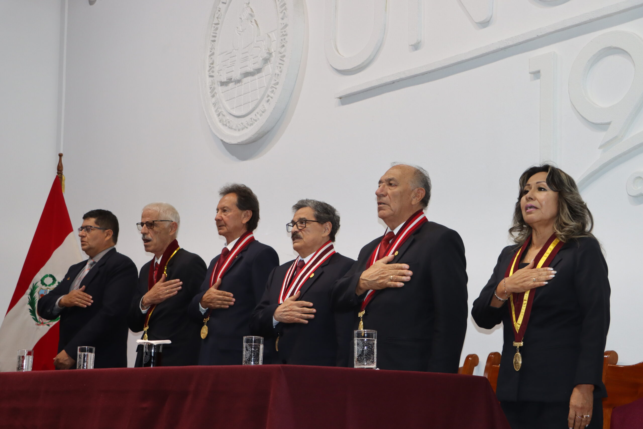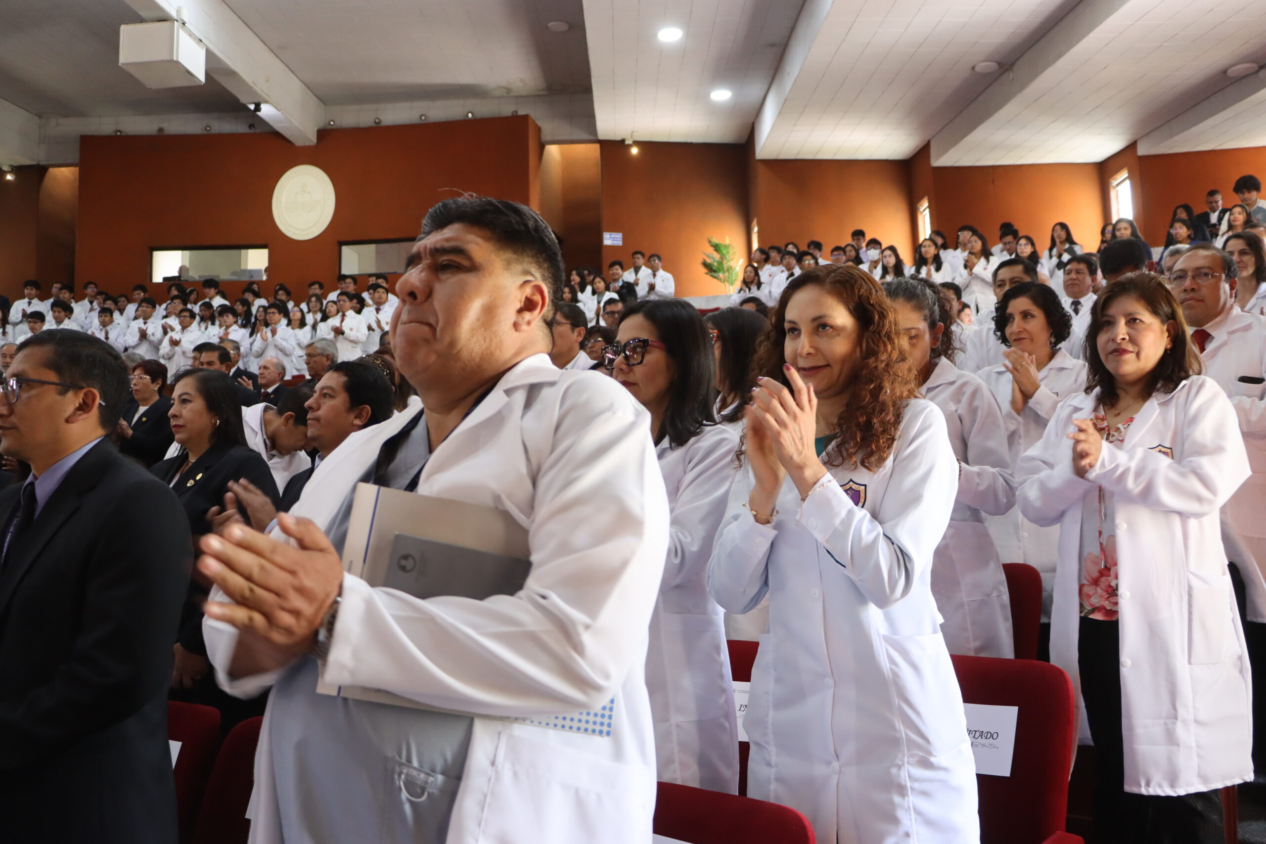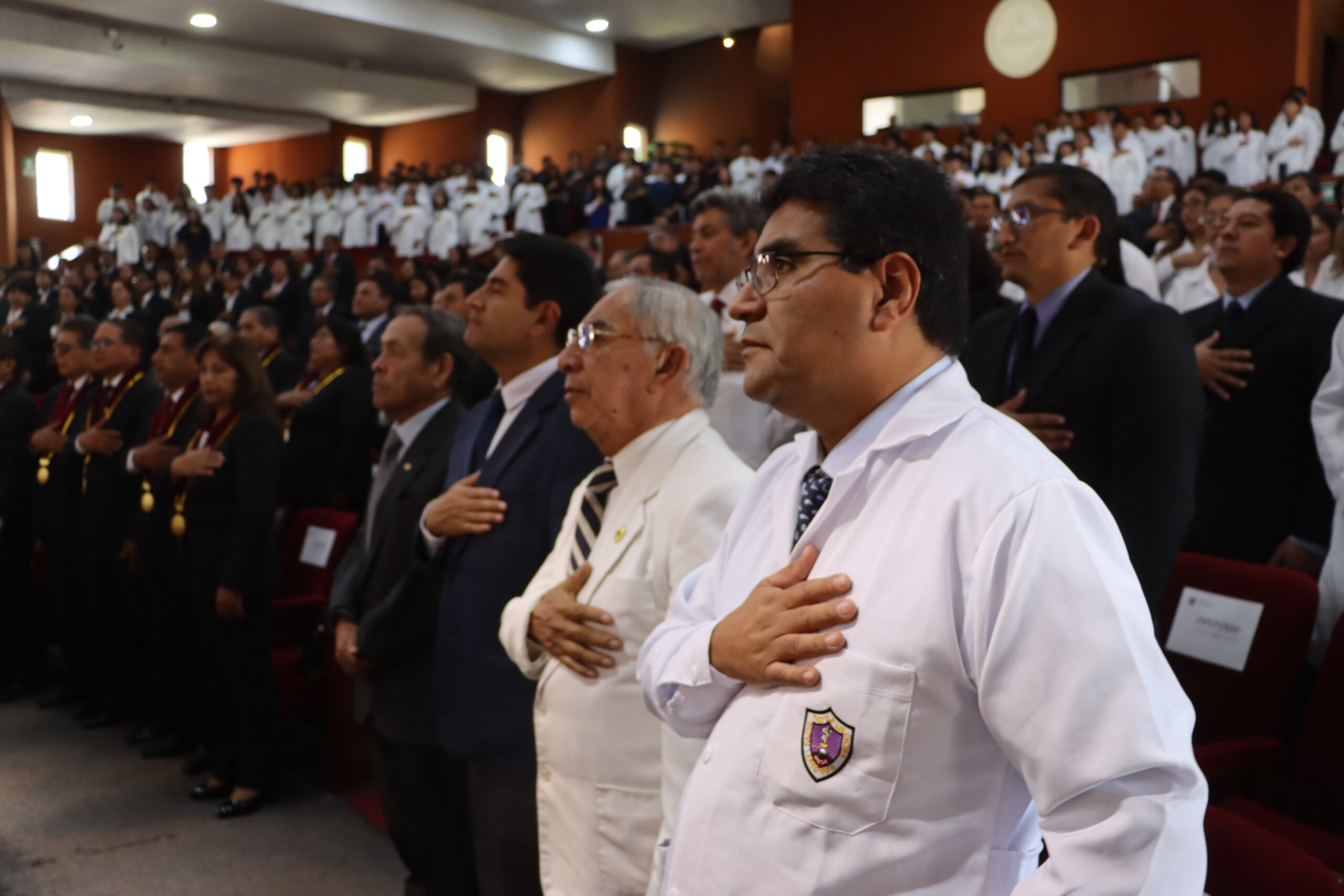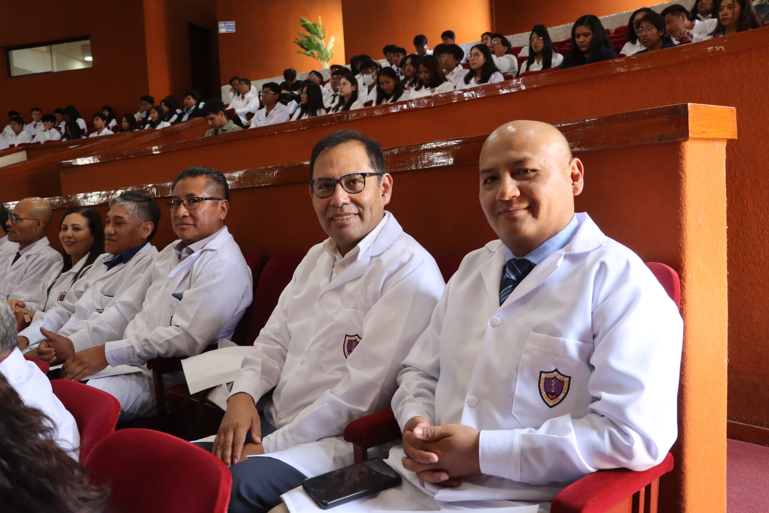 En la mesa protocolar estuvieron acompañándolo el rector agustino, Dr. Hugo Rojas Flores; Dr. Luis Cuadros Paz, vicerrector académico; Dr. Henry Polanco Cornejo, vicerrector de investigación; la secretaria general, doctora Maritza Chirinos Lazo; y el docente, doctor Mauricio Benavente Loza, quienes encabezaron el acto que conmemora décadas de formación médica en la región.
