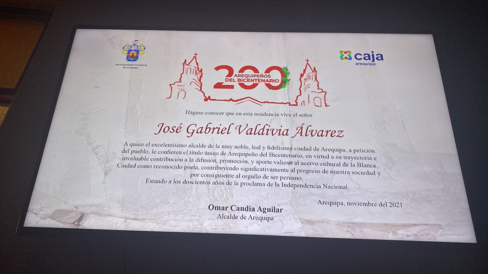 La Municipalidad Provincial de Arequipa incluyó al catedrático agustino entre las personalidades a quienes se les entregó la mención, además de una placa recordatoria colocada en su vivienda.