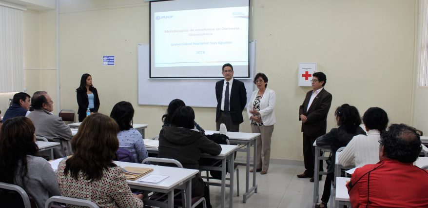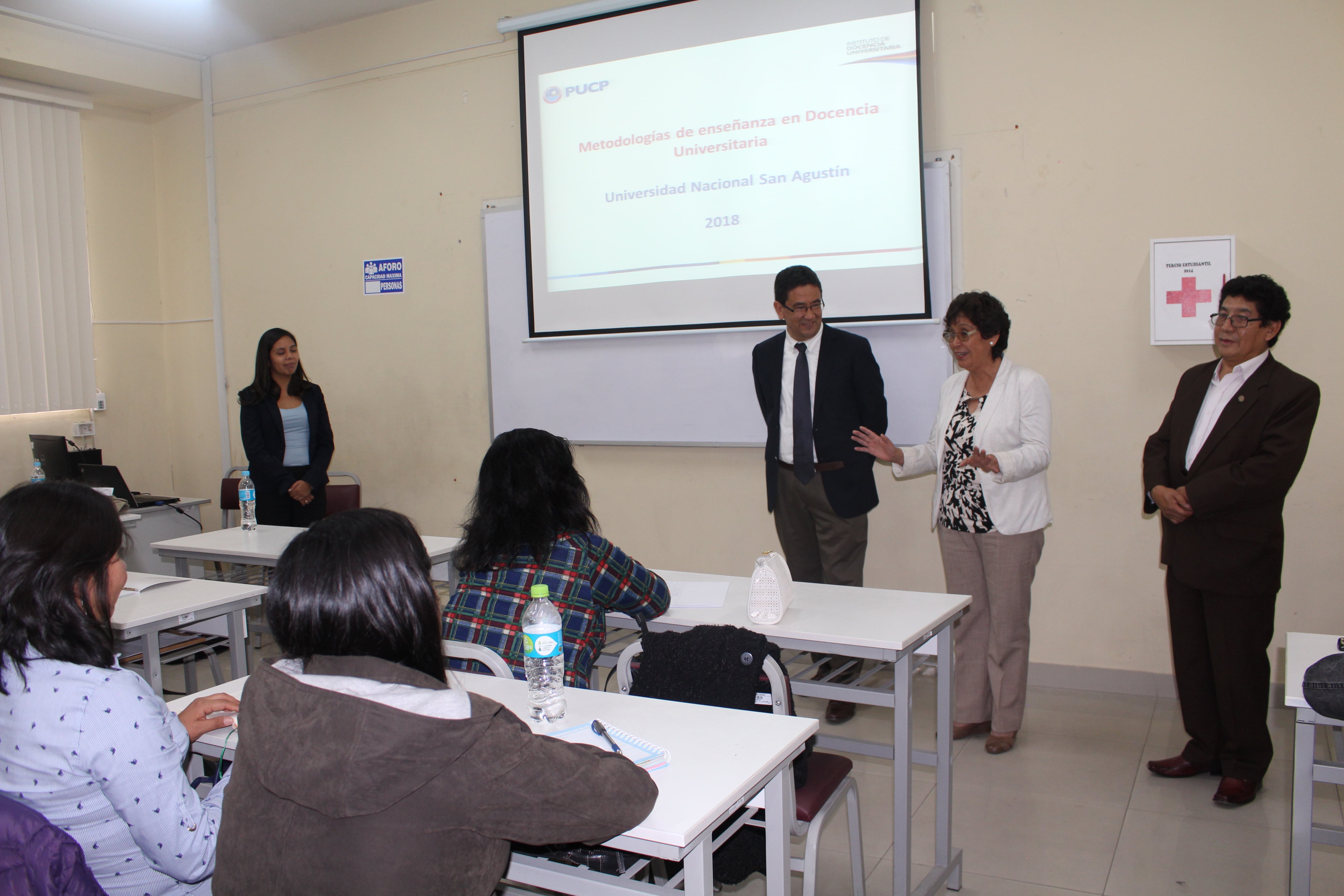 El Vicerrectorado Académico de la Universidad Nacional de San Agustín de Arequipa, a través de la Dirección de Desarrollo Docente, viene desarrollando la primera jornada de capacitación dirigida a todos los docentes de esta casa superior de estudios, dentro del temario se inició el curso taller Semipresencial de Metodología de enseñanza de Docencia Universitaria a cargo de los expertos: Julio Del Valle, Sylvana Valdivia y Victoria Landa, integrantes del Instituto de Docencia Universitaria de la Pontificia Universidad Católica del Perú PUCP.