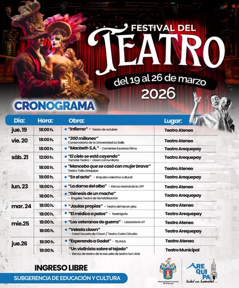 Este evento, organizado por la Subgerencia de Educación y Cultura de la Municipalidad Provincial de Arequipa (MPA), reunirá a diversas compañías, como el Elenco de Teatro de la Escuela de Arte Son Arte y el Teatro de Octubre y los elencos de La Salle y UTP, entre otros, prometiendo una semana repleta de actuaciones memorables.