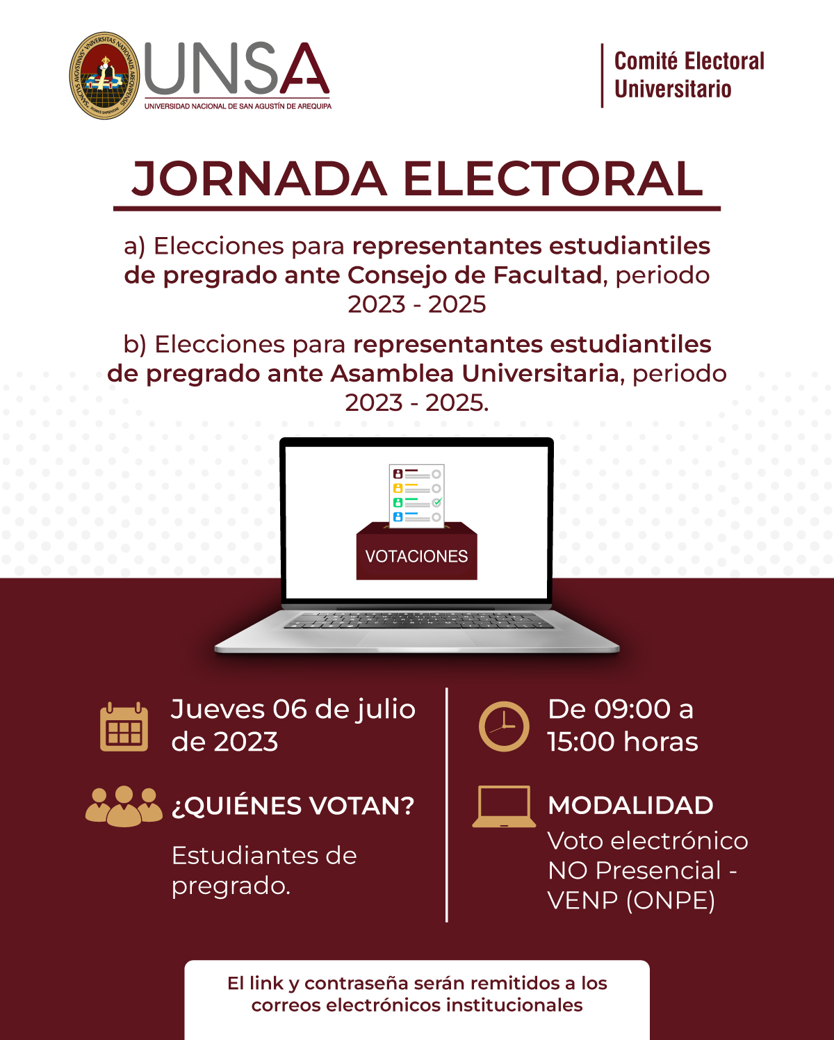 El Comité Electoral Universitario recordó a la comunidad universitaria que este 6 de julio se llevará a cabo la Elección para representantes estudiantiles de pregrado ante el Consejo de Facultad y Asamblea Universitaria, periodo 2023 – 2025.