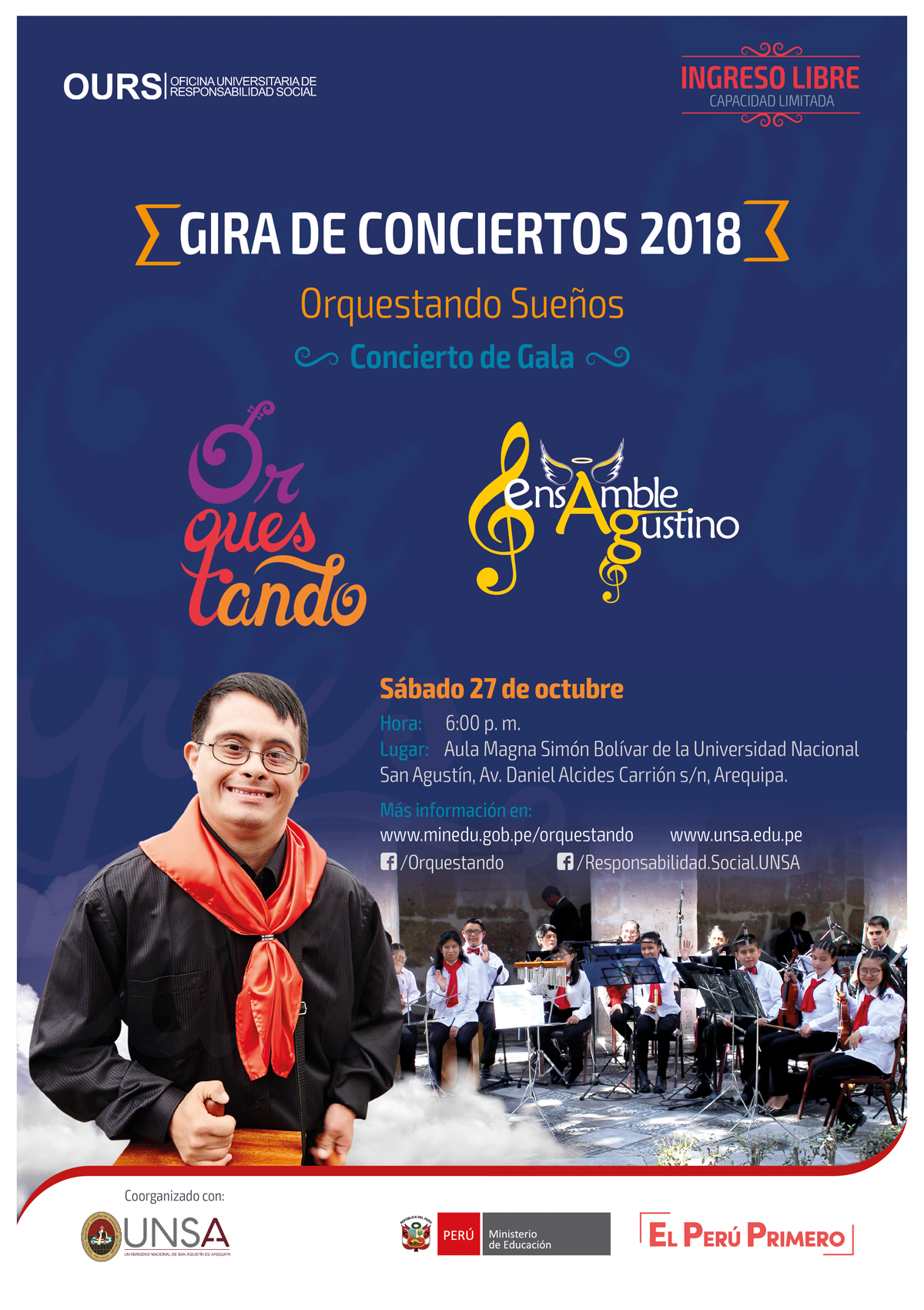 La Universidad Nacional de San Agustín de Arequipa y la Oficina Universitaria de Responsabilidad Social, invitan a la comunidad agustina y al público en general al Concierto de Gala «Orquestando Sueños», con la participación de la Orquesta de Cámara «Ensamble Agustino» y del Programa Formativo Inclusivo «Orquestando», a realizarse en las instalaciones del Aula Magna, el próximo 27 de octubre del presente, la hora de ingreso será a partir de las 17:30 horas y su inicio será a las 18:00 horas, por lo que agradeceremos contar con su gentil asistencia.