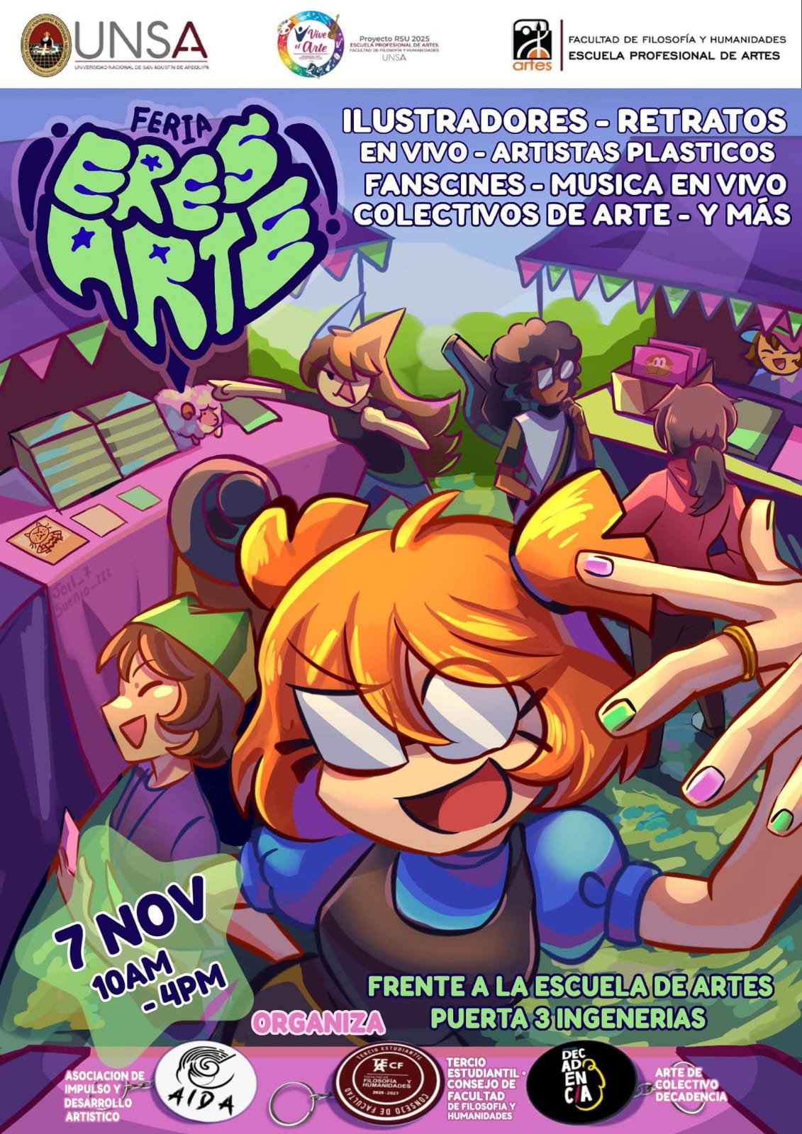La cita es el viernes 7 de noviembre, de 10:00 am a 4:00 pm, en el frontis de la Escuela Profesional de Artes, con acceso por la puerta de la Av. Venezuela, en el área de Ingenierías de la UNSA. Se espera una gran afluencia de público, incluyendo estudiantes, profesores, artistas locales y amantes del arte en general. «Eres Arte 2025» se presenta como una oportunidad única para descubrir el talento artístico que se gesta en la UNSA y para apoyar a los jóvenes creadores que están dando forma al futuro del arte en Arequipa.