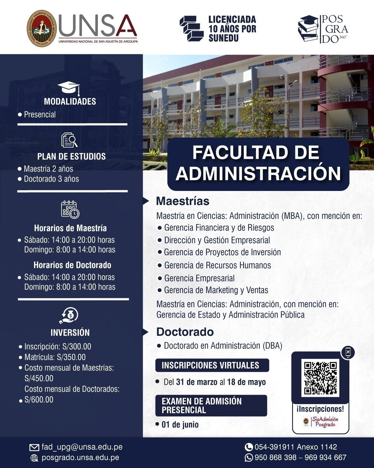 La Unidad de Posgrado de la Facultad de Administración anunció su convocatoria 2025 para los programas de Maestría y Doctorado en Ciencias de la Administración, con diversas menciones orientadas a formar líderes especializados en gestión, inversión, marketing, recursos humanos y administración pública.