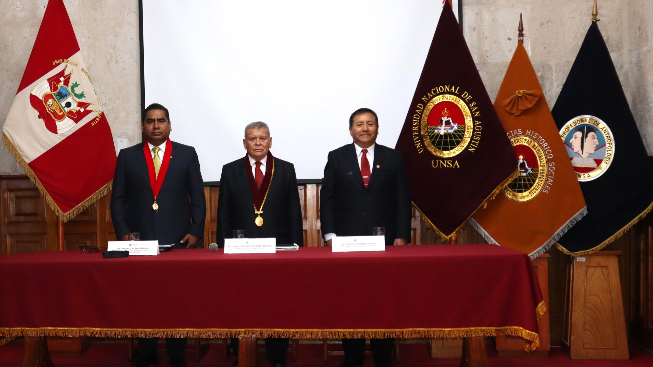 La ceremonia de presentación del programa de festejos fue presidida por el Dr. Jorge Paredes Rondón, decano de la facultad, y contó con la participación del Dr. Abdón Almonte Mamani, director de la Escuela, así como del Dr. Miguel Céspedes Carpio, presidente de la Comisión de Festejos.