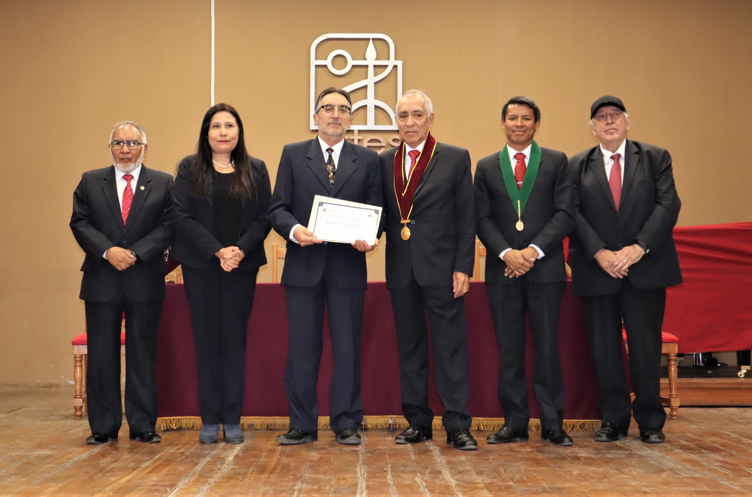 En un momento especial de la ceremonia se rindió un reconocimiento a la excelencia académica del maestro Dr. Ricardo Córdova Farfán, destacado pintor galardonado con premios nacionales e internacionales, quien formó a más de 30 promociones de artistas y que este año deja la docencia en la UNSA.