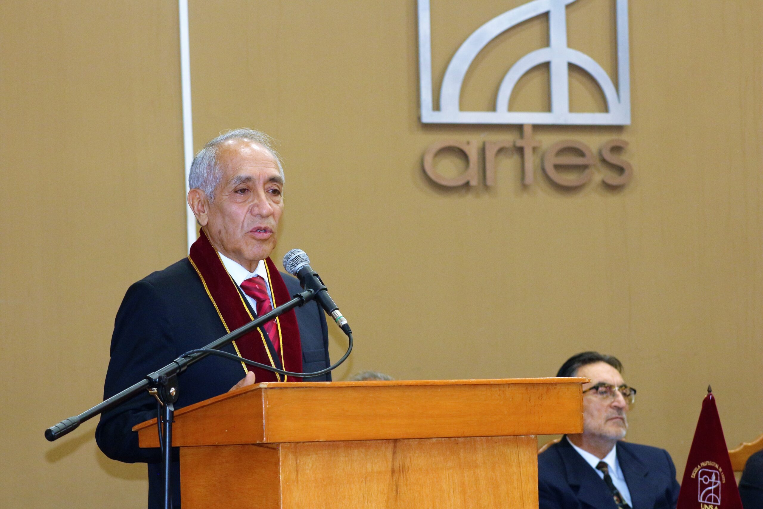 El discurso de orden estuvo a cargo del Director del Departamento Académico de Arte, Víctor Hugo Zeta Cruz, quien indicó que la ceremonia era un momento de alegría y reflexión, para rendir homenaje a la institución y a los que fueron y son participes de su desarrollo.