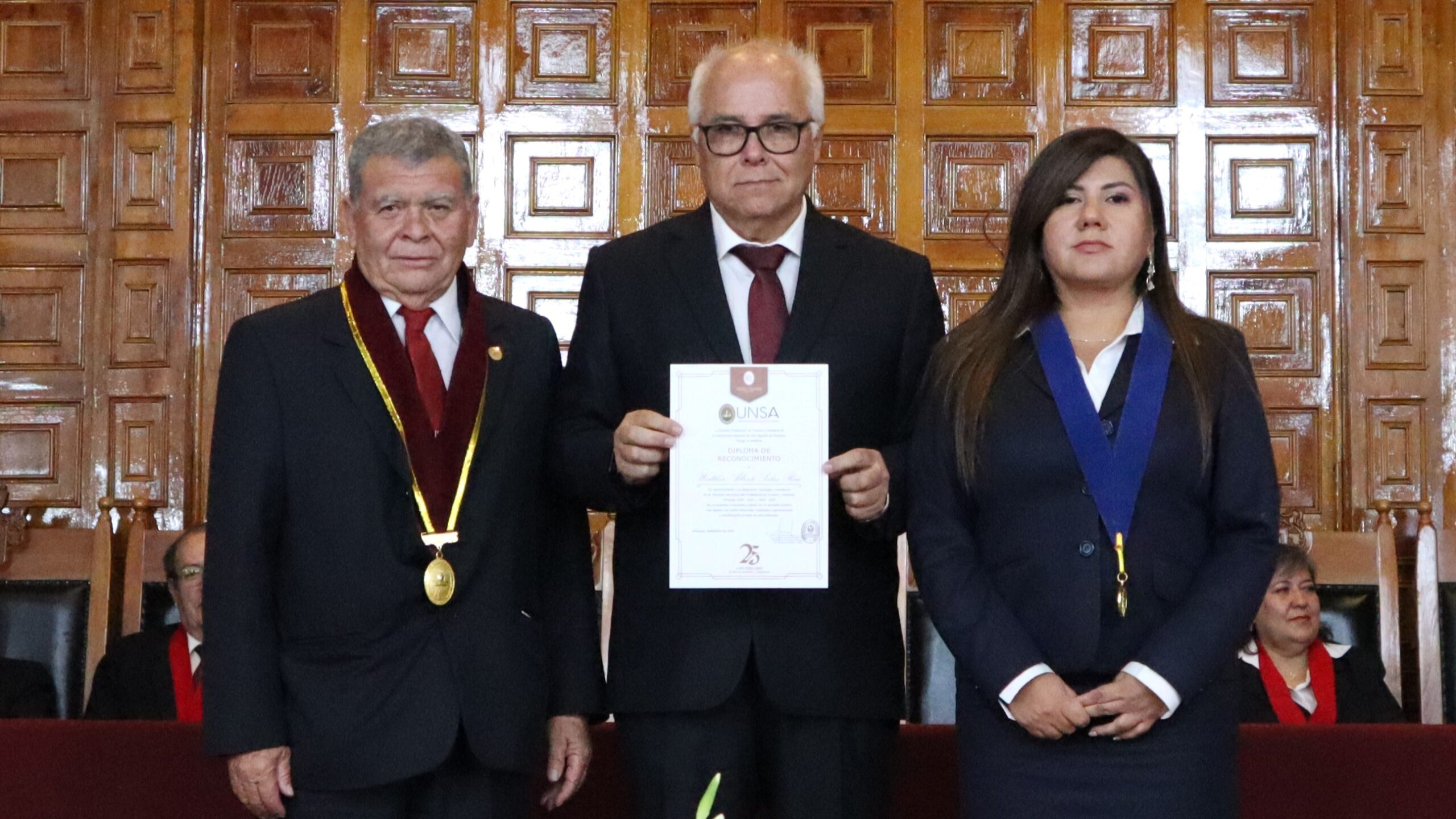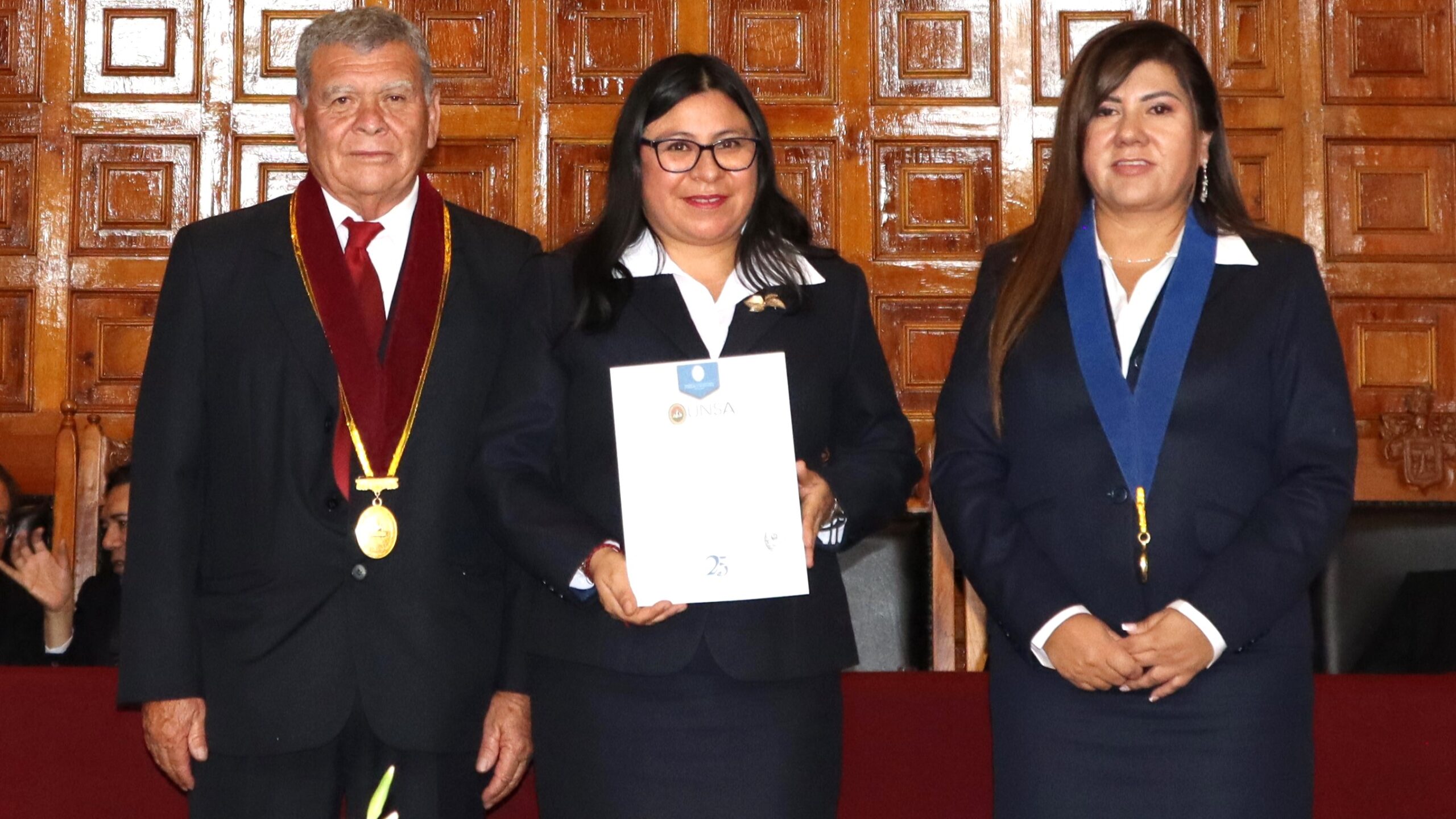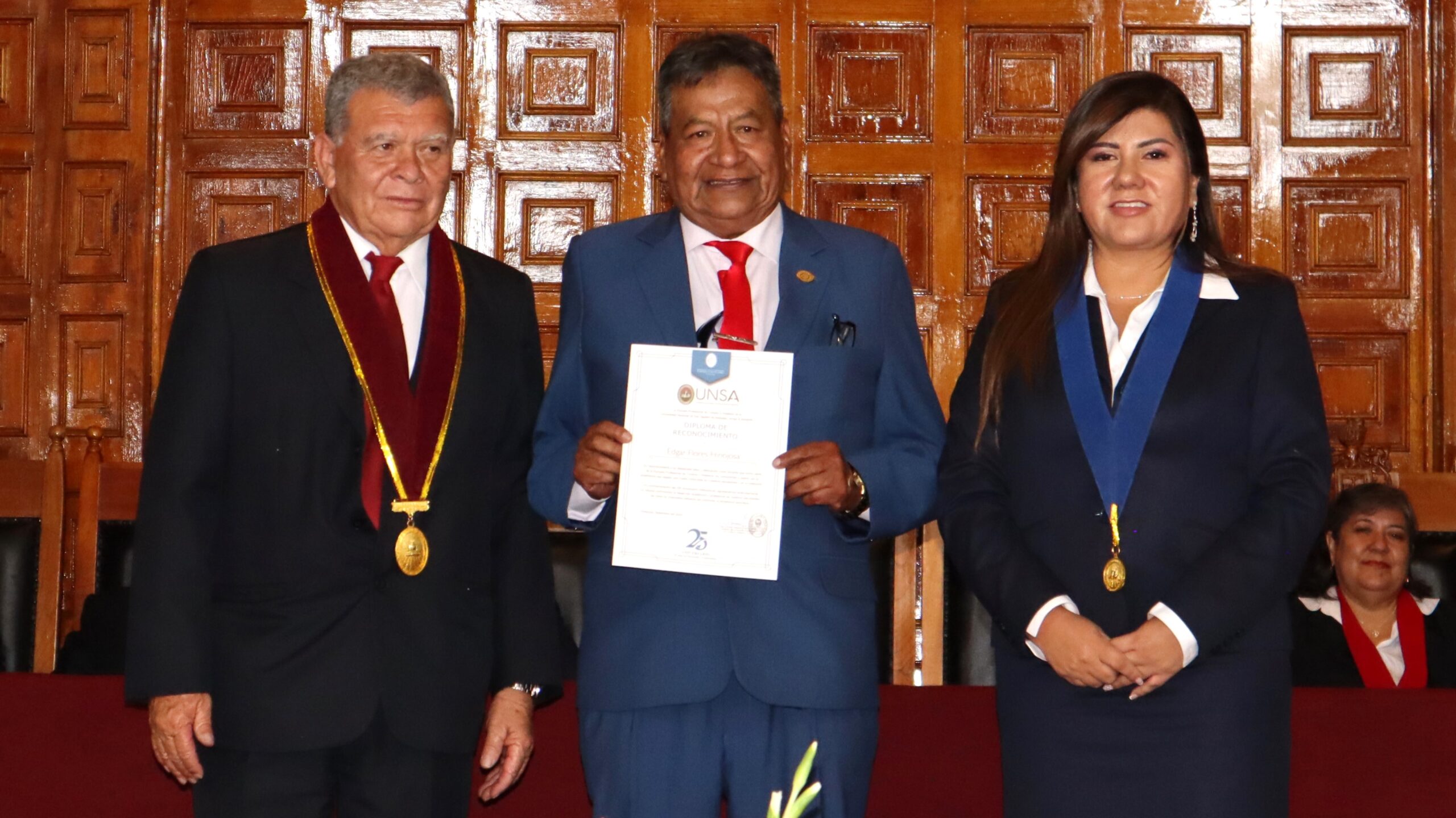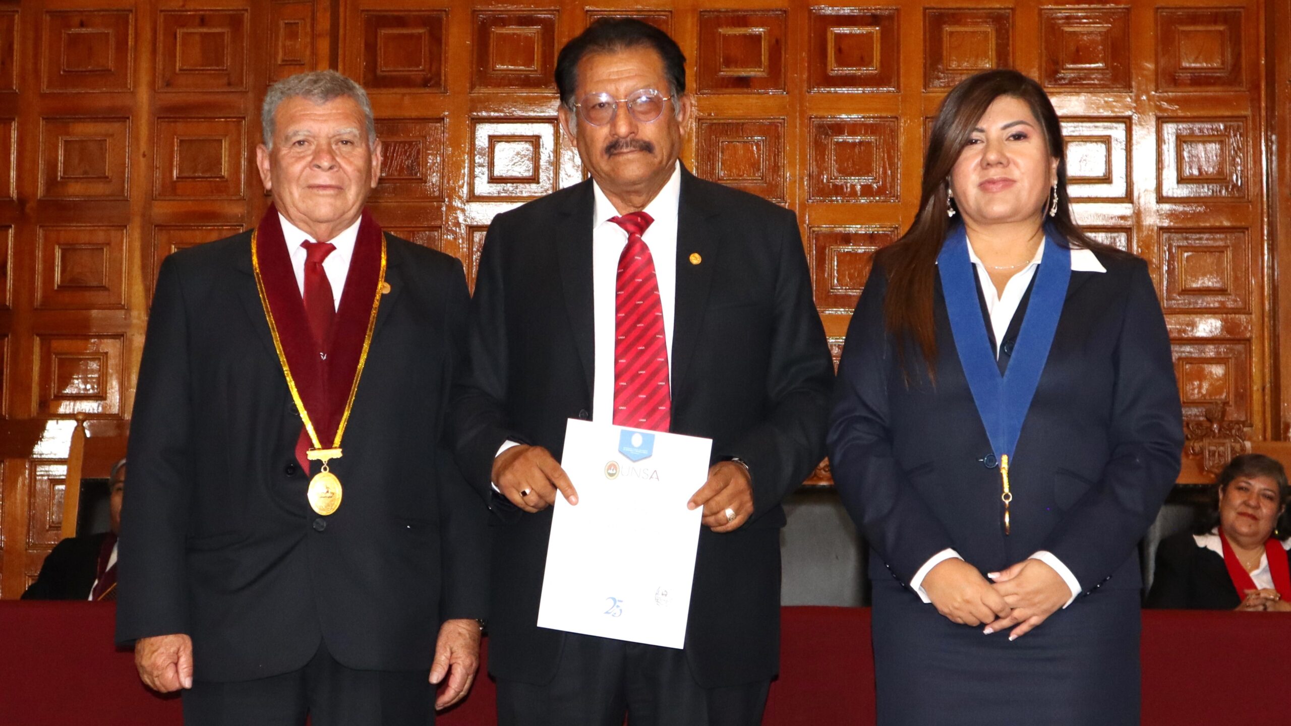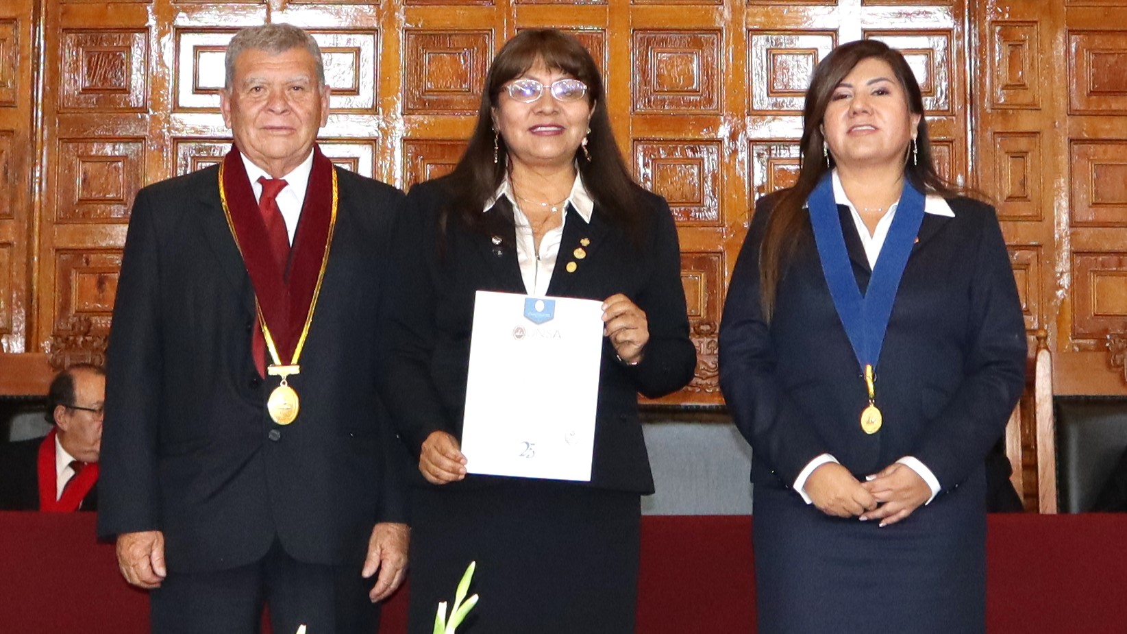 Antes de finalizar el acto protocolar, el decano y la directora otorgaron reconocimientos a los exdirectores y exdocentes de la escuela profesional en mérito a su contribución al desarrollo de este programa, cuyo objetivo es posicionarse como el mejor de la macrorregión.