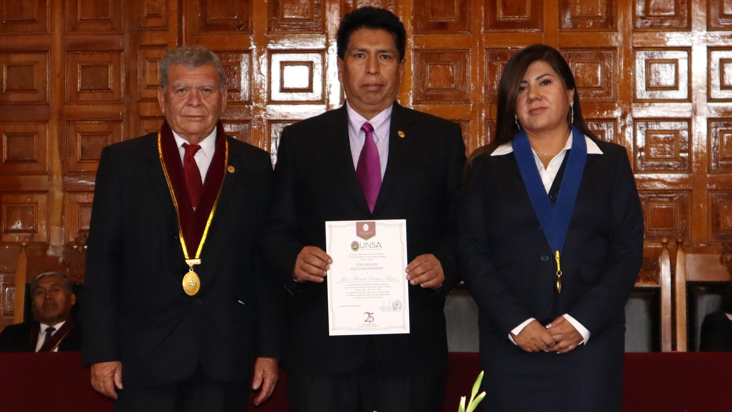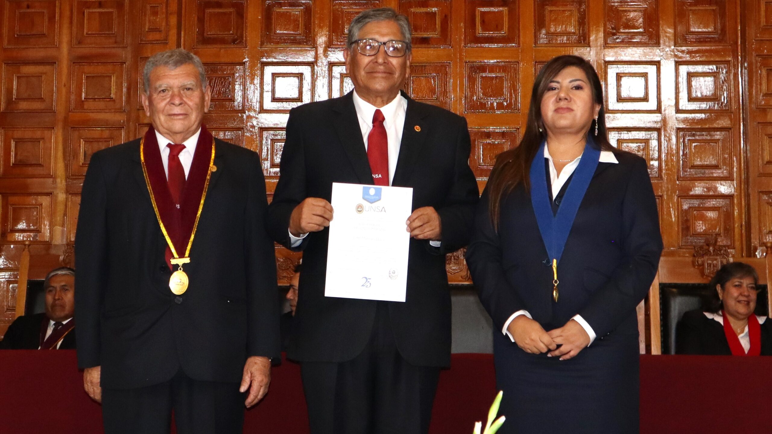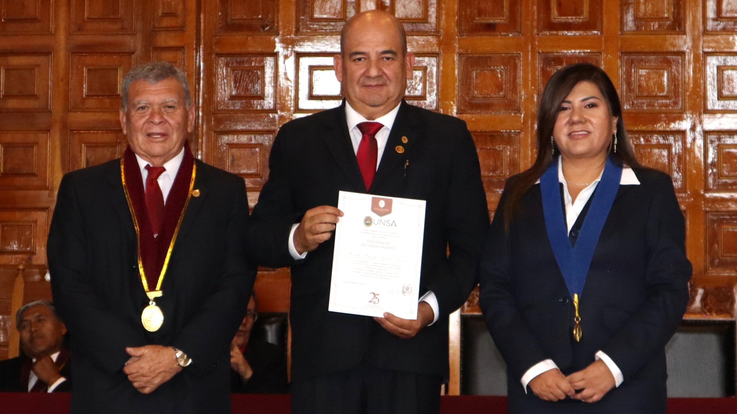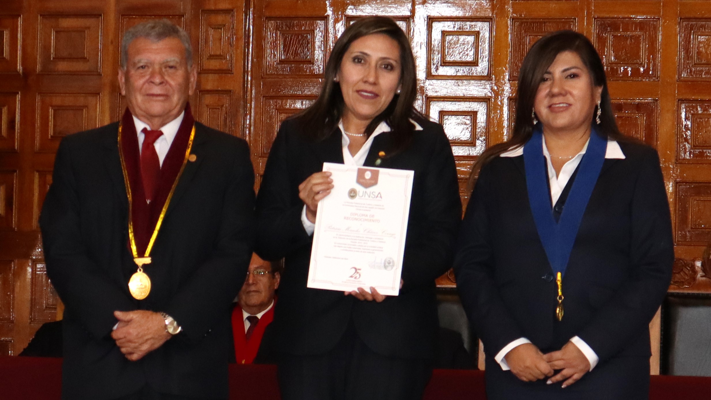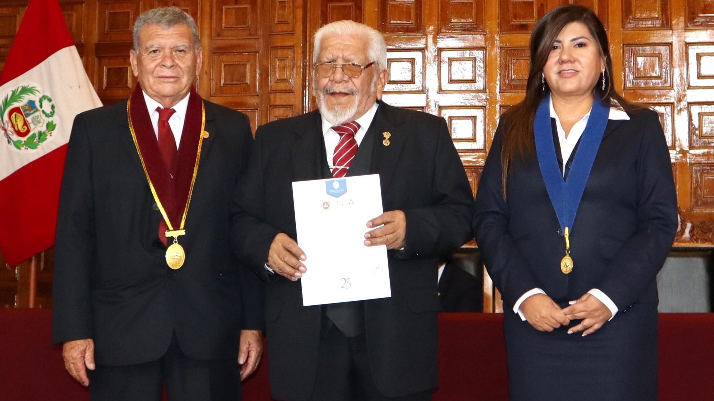 Antes de finalizar el acto protocolar, el decano y la directora otorgaron reconocimientos a los exdirectores y exdocentes de la escuela profesional en mérito a su contribución al desarrollo de este programa, cuyo objetivo es posicionarse como el mejor de la macrorregión.