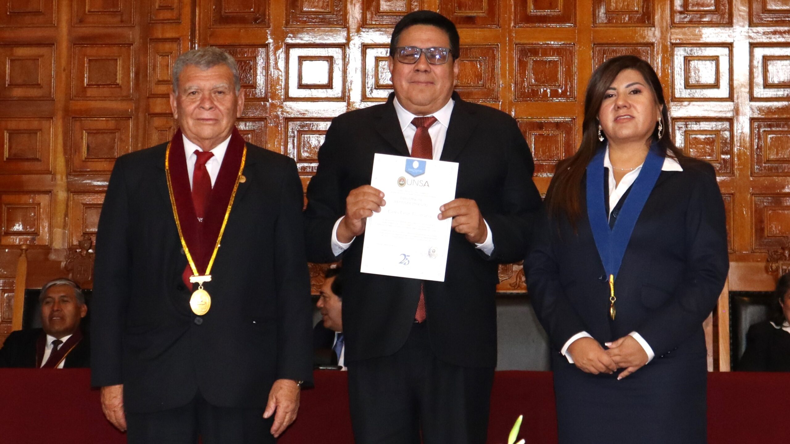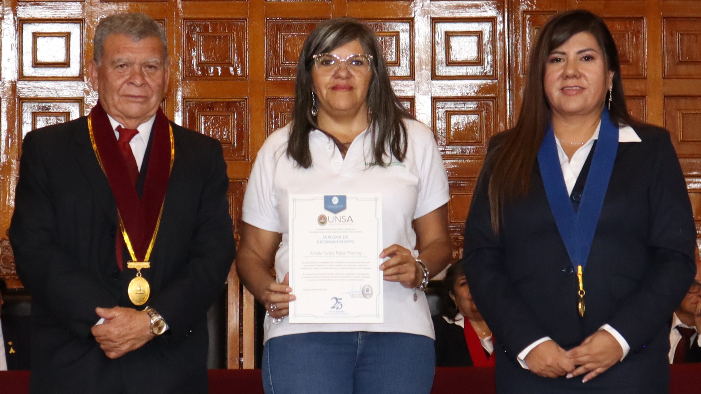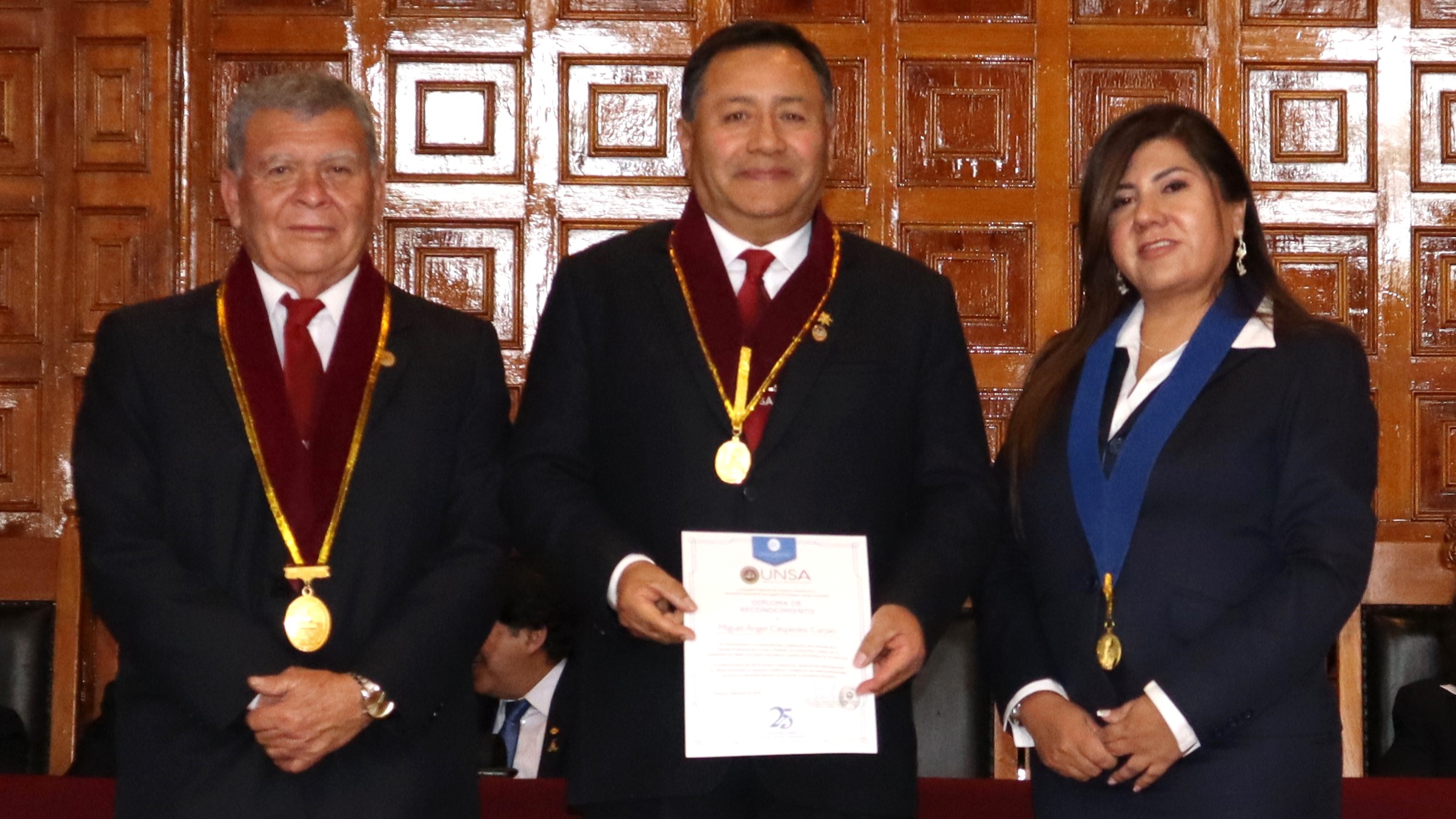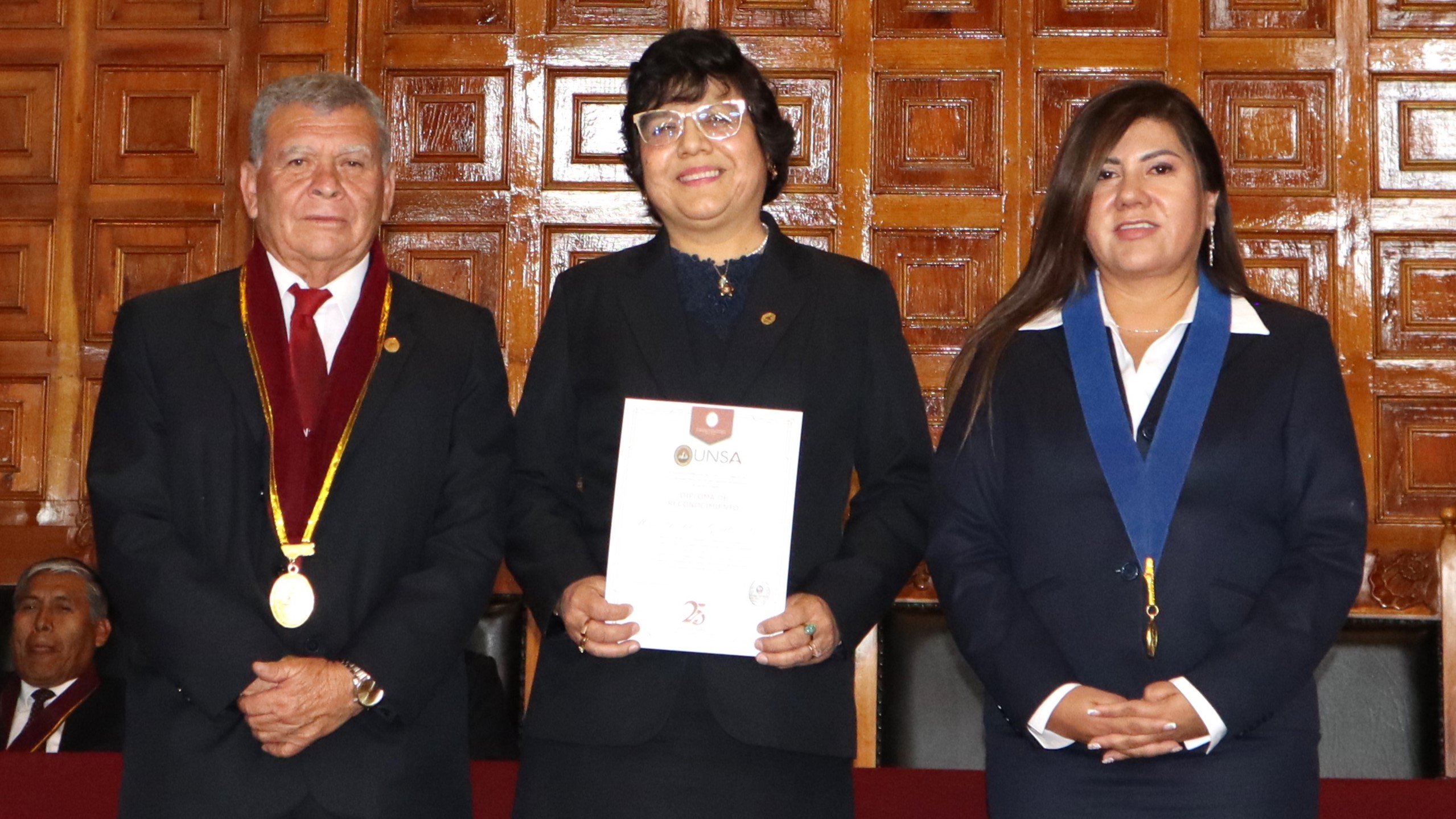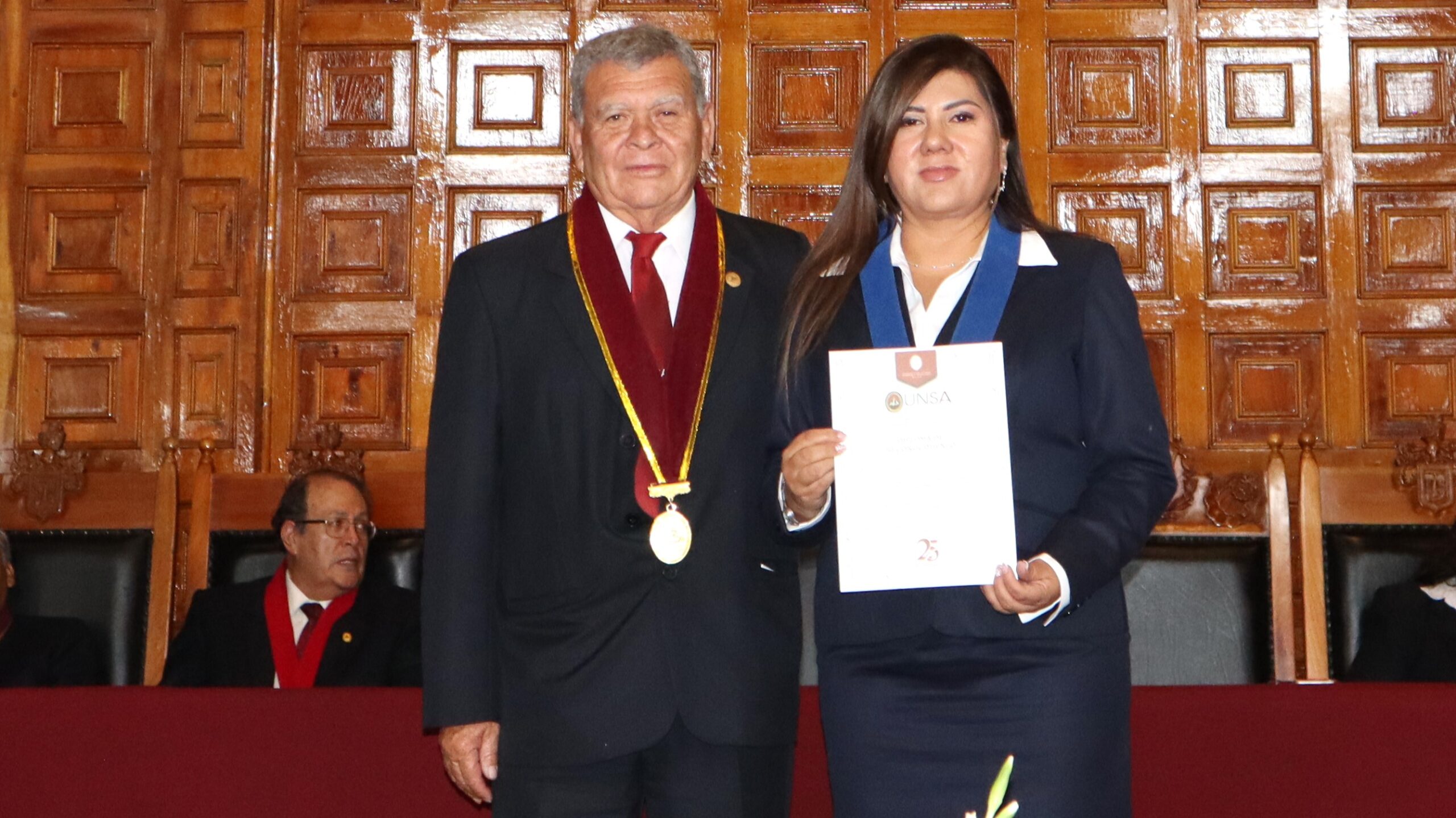 Antes de finalizar el acto protocolar, el decano y la directora otorgaron reconocimientos a los exdirectores y exdocentes de la escuela profesional en mérito a su contribución al desarrollo de este programa, cuyo objetivo es posicionarse como el mejor de la macrorregión.