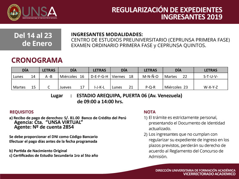 odos los ingresantes 2019 a la Universidad Nacional de San Agustín de Arequipa, que no pudieron regularizar su expediente por diversos motivos podrán efectuar el trámite en la puerta N° 7 del Estadio Arequipa de la UNSA de 09:00 a 14:00 horas, el trámite es estrictamente personal; de no hacerlo perderán su derecho de acuerdo al reglamento de admisión de esta casa superior de estudios.