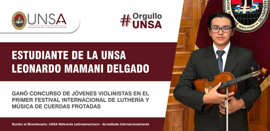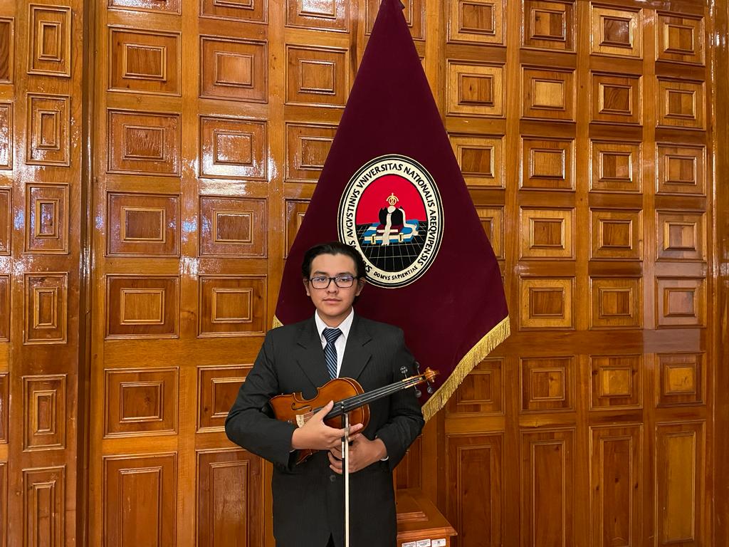 El estudiante de primer año de la Escuela Profesional de Artes de la Universidad Nacional de San Agustín de Arequipa, Leonardo Abraham Mamani Delgado, ganó el concurso de jóvenes violinistas organizado en el marco del I Festival Internacional de Luthería y Música de Cuerdas Frotadas.