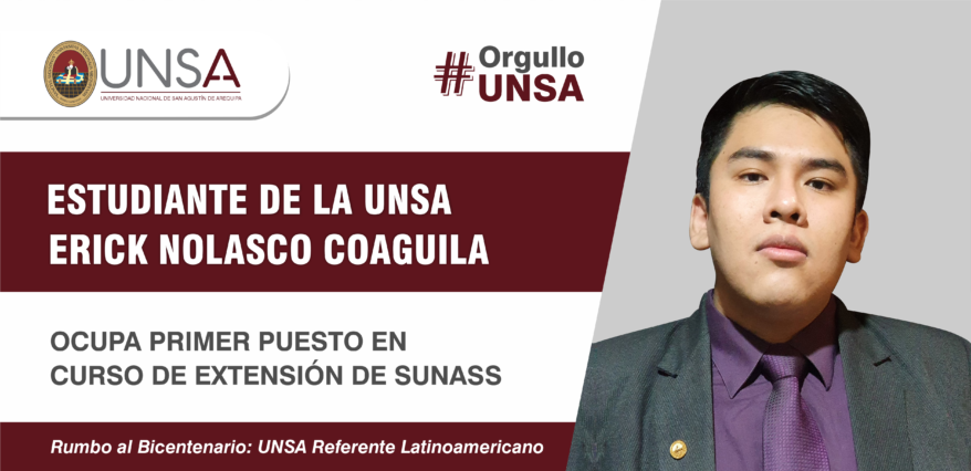 El estudiante del quinto año de Derecho de la Universidad Nacional de San Agustín de Arequipa, Erick Andrés Nolasco Coaguila, ocupó el primero lugar en las evaluaciones del XV Curso de Extensión Universitaria (CEU) de Servicios de Saneamiento organizado por la Sunass.