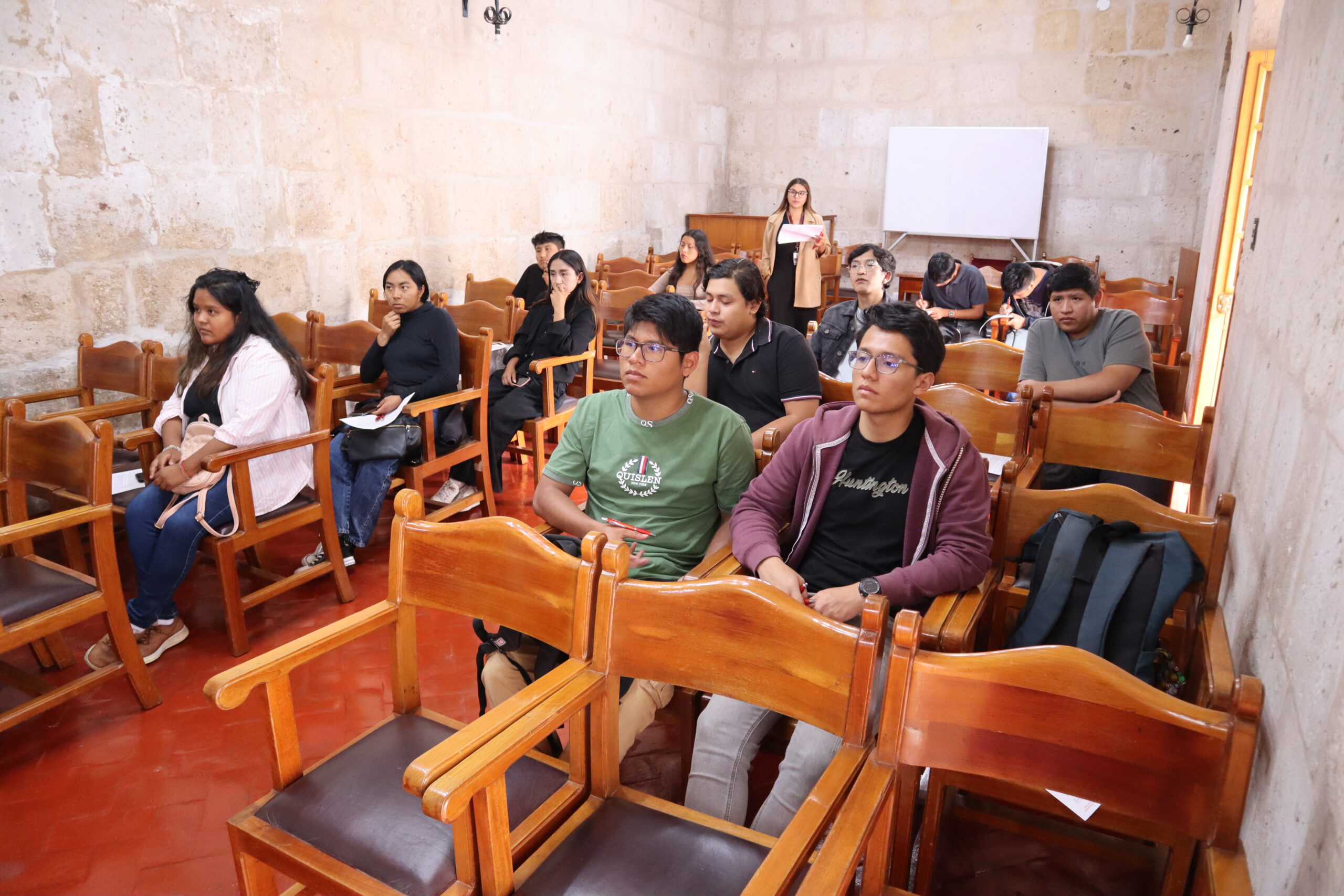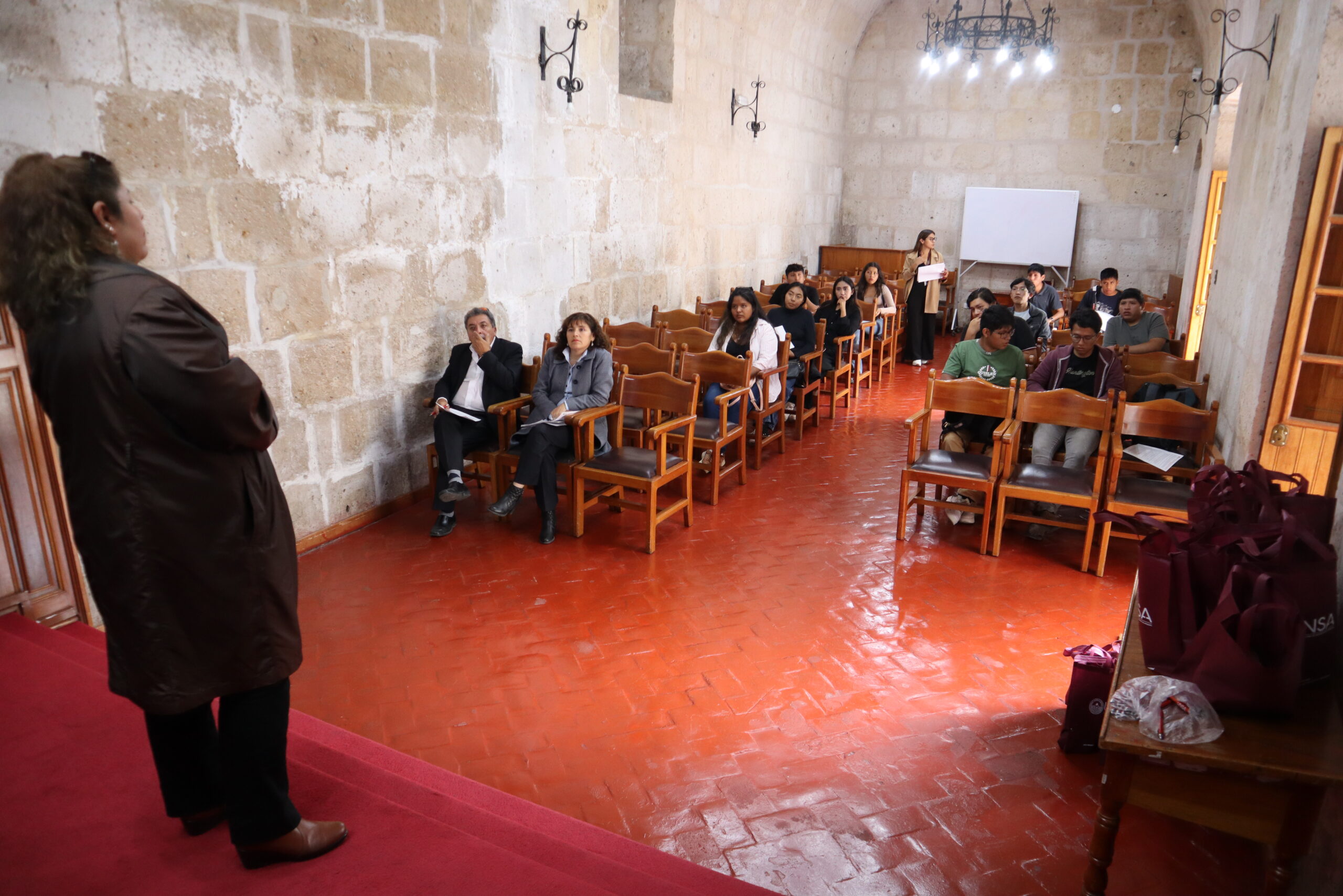 La licenciada Clara Luz Calla Suárez, servidora administrativa de la Oficina de Cooperación y Relaciones Internacionales (OCRI) de la UNSA, ofreció una charla de inducción a los estudiantes becarios, para informar todos los trámites que se deben efectuar y también para motivar a los estudiantes y fortalecer su identificación con la UNSA.