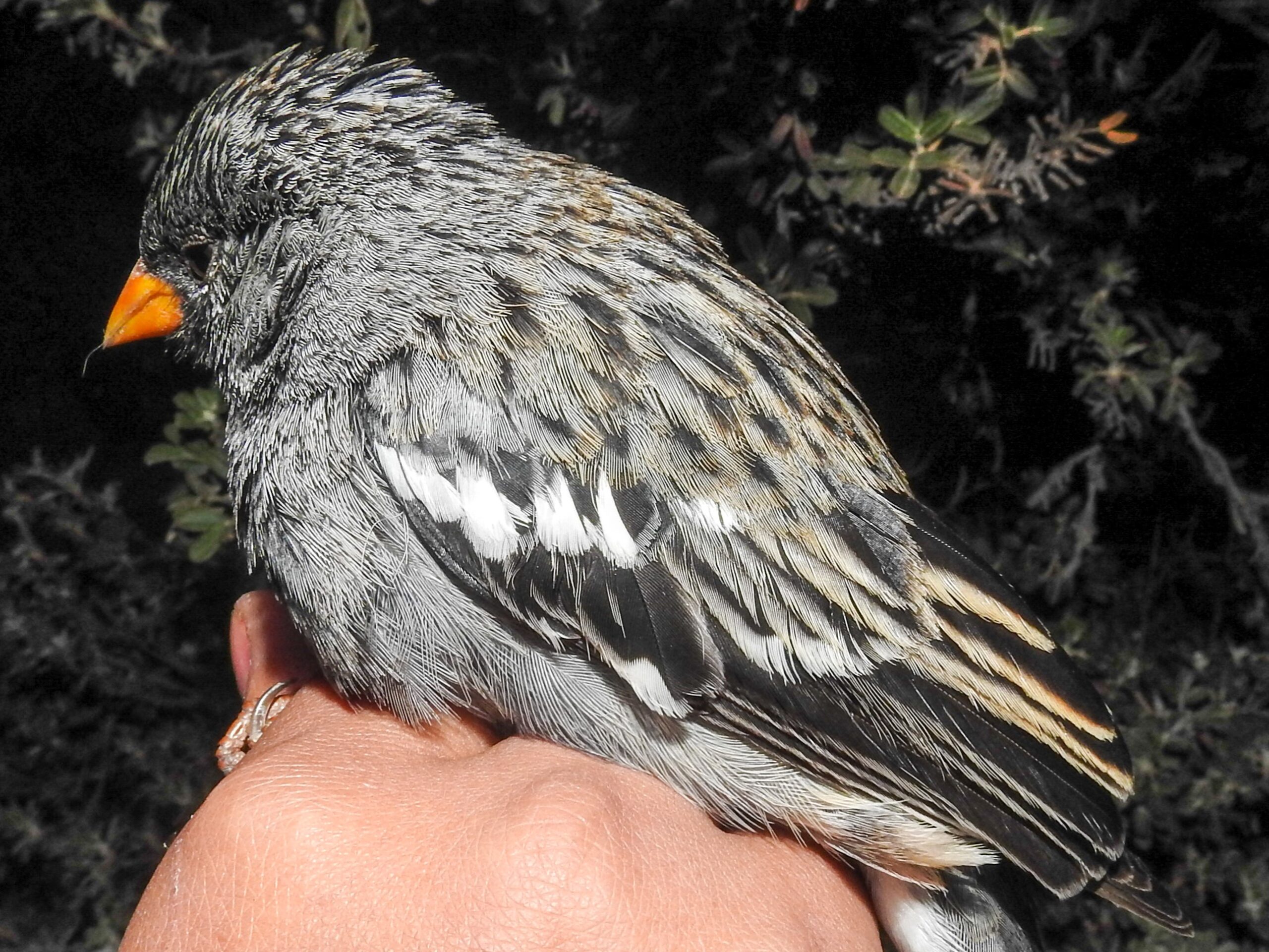 Fringilo de pecho negro (Rhopospina fruticeti), plumas de color grisáceo y negro con franjas blancas en las alas; resalta su pico de color naranja intenso, que le ayuda a comer semillas secas y duras.