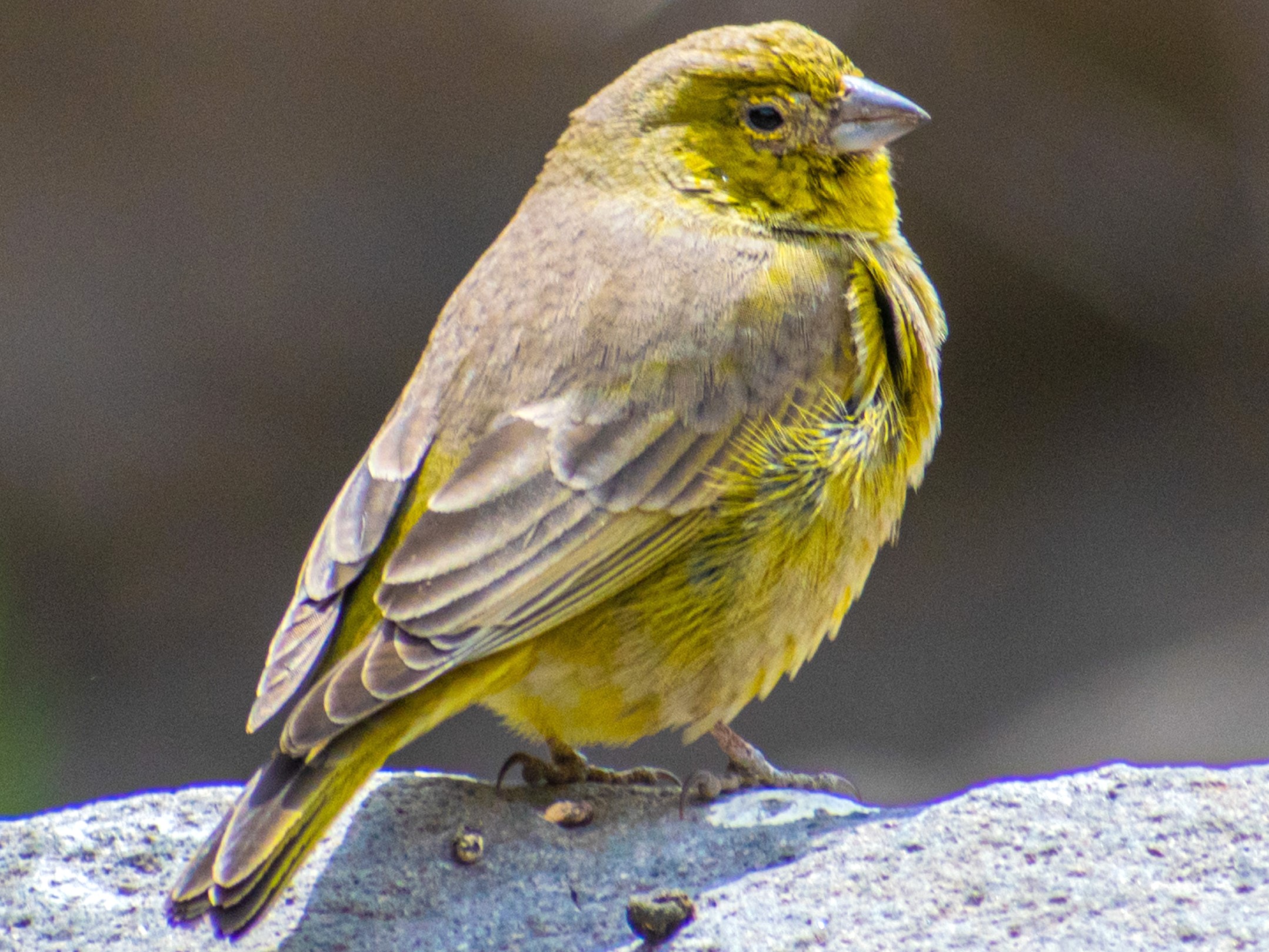 Jilguero oliváceo (Sicalis olivascens), avistado en una quebrada cerca del río, resalta del paisaje gris por su plumaje amarillo verdoso.