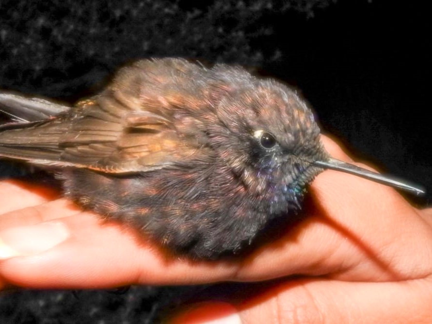 Colibrí negro (Metallura Phoebe), hermoso ejemplar propio de Arequipa, que frente a la luz sus plumas presentan iridiscencia, dándole brillos rojizos y verdes.