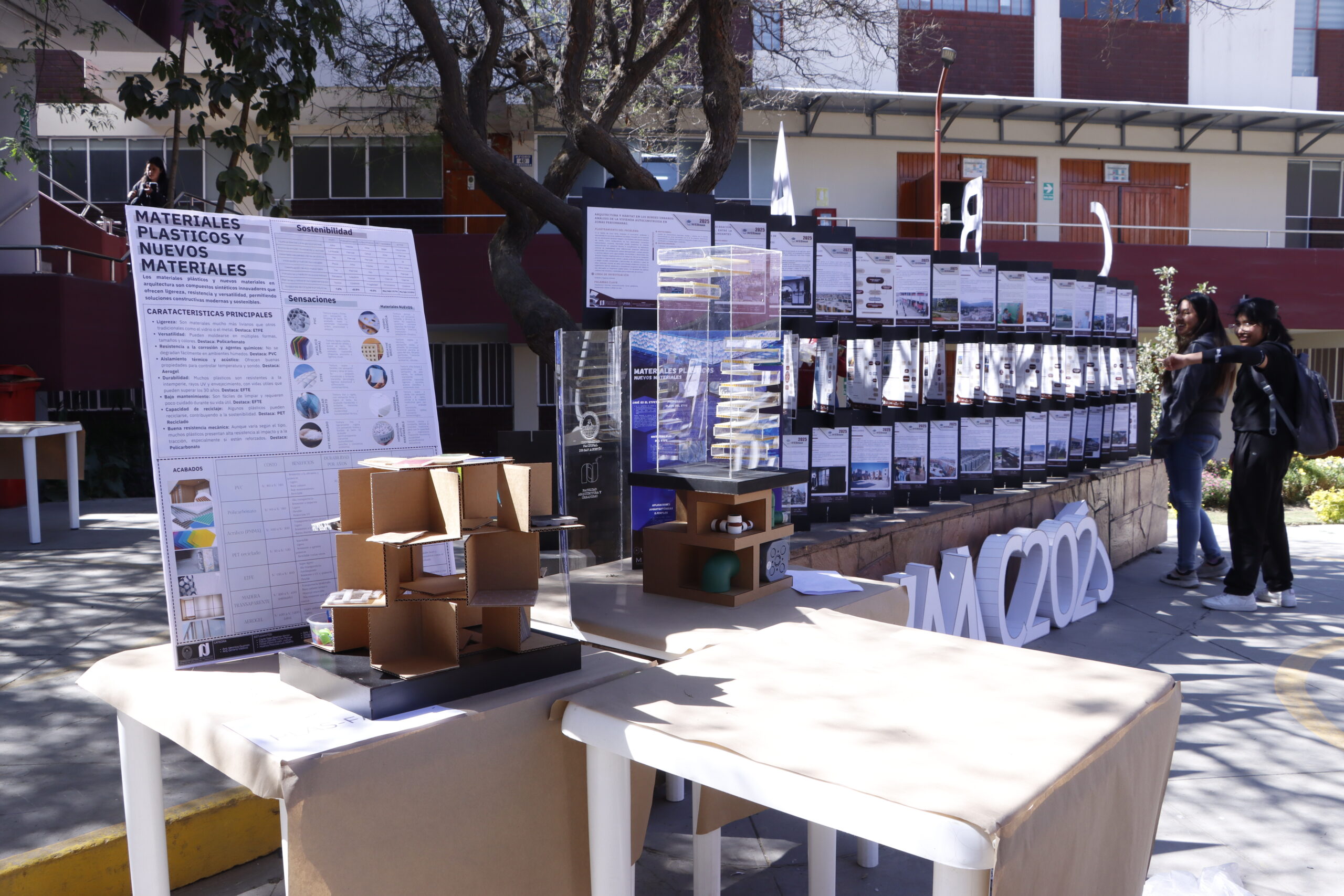 La muestra, realizada el 16 de julio en el patio de la facultad, reunió los trabajos del curso de Materiales del tercer semestre, desarrollados en colaboración entre estudiantes y docentes. A través de paneles y catálogos interactivos, se presentaron diversos materiales empleados en obras arquitectónicas.