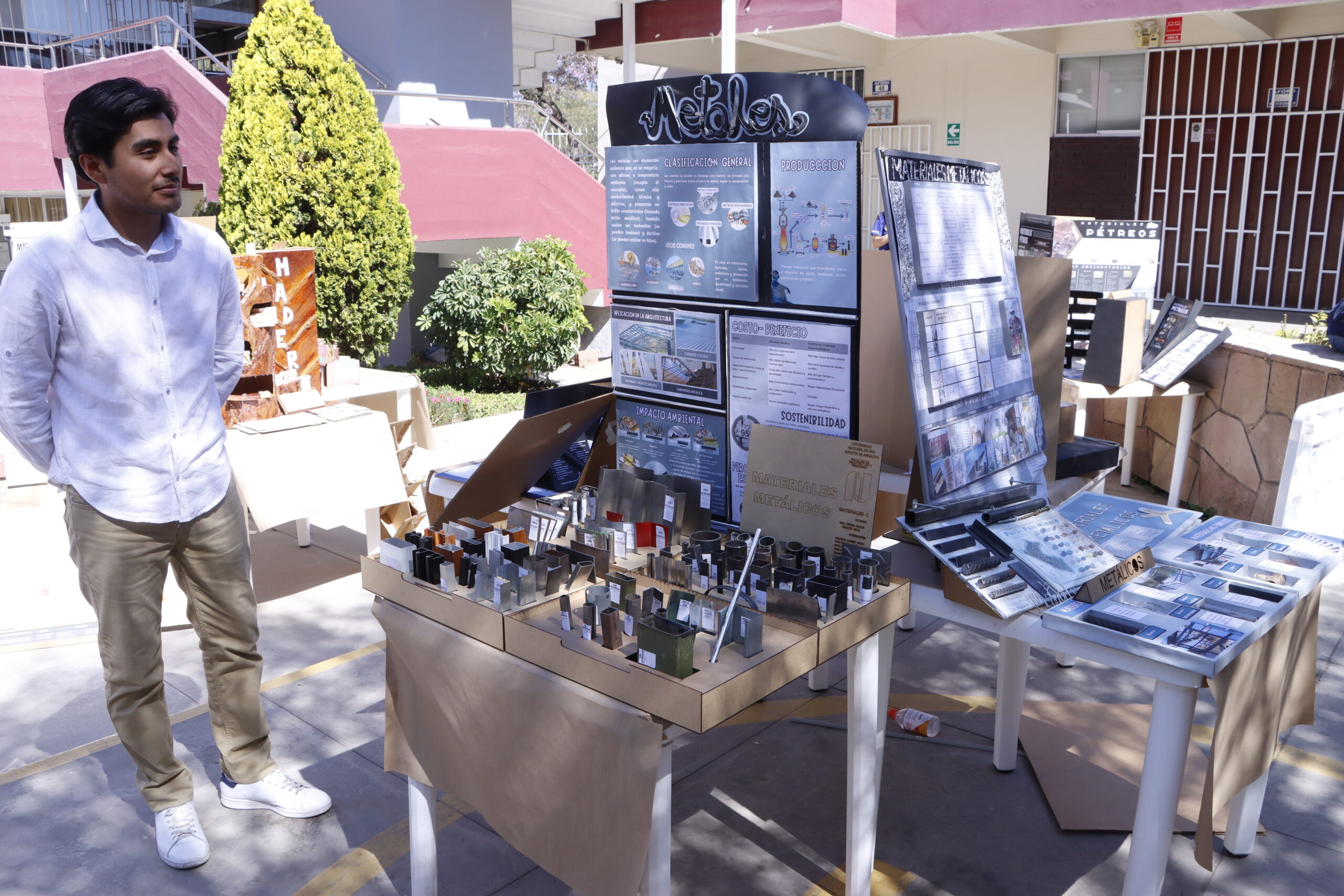 La muestra, realizada el 16 de julio en el patio de la facultad, reunió los trabajos del curso de Materiales del tercer semestre, desarrollados en colaboración entre estudiantes y docentes. A través de paneles y catálogos interactivos, se presentaron diversos materiales empleados en obras arquitectónicas.