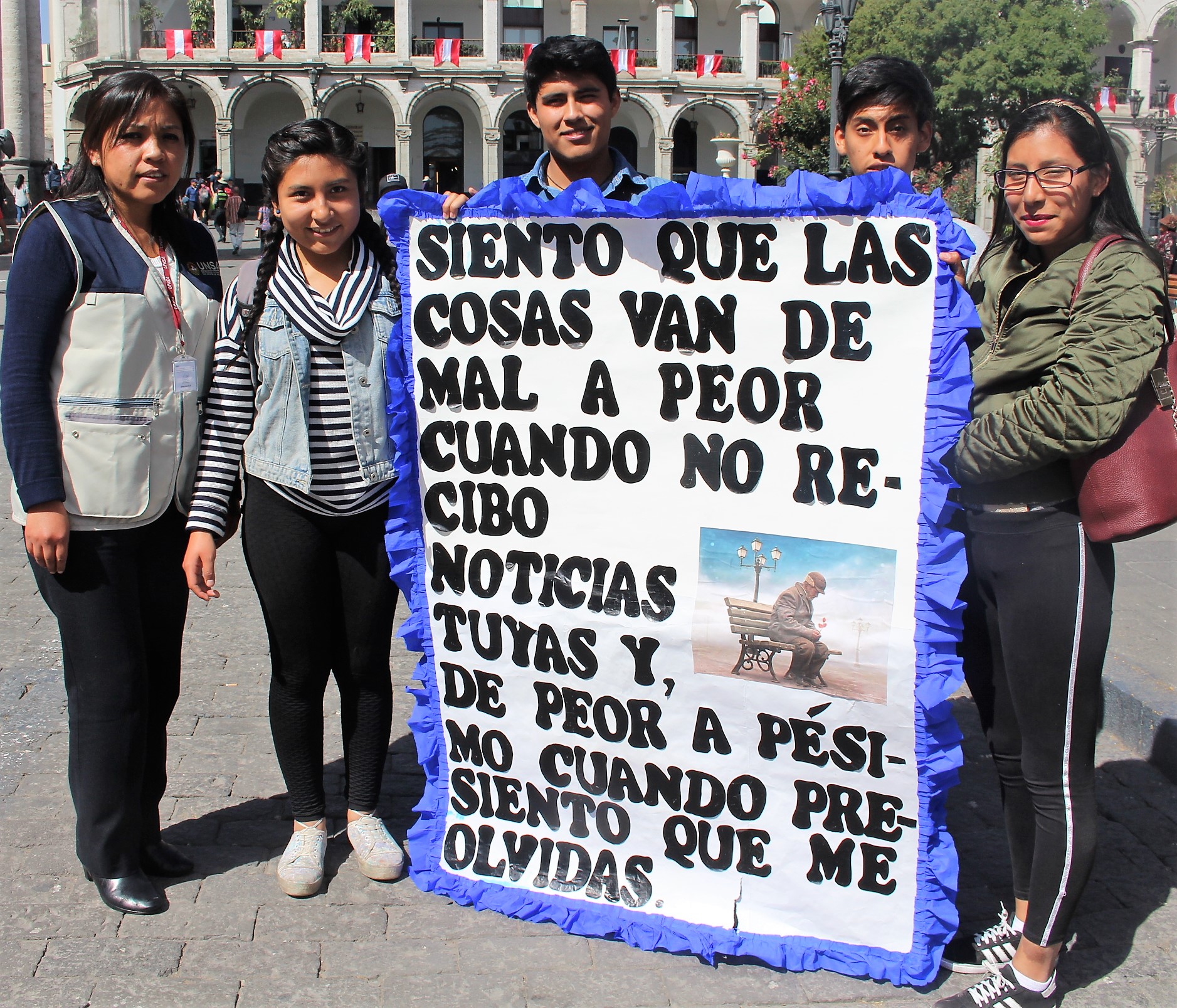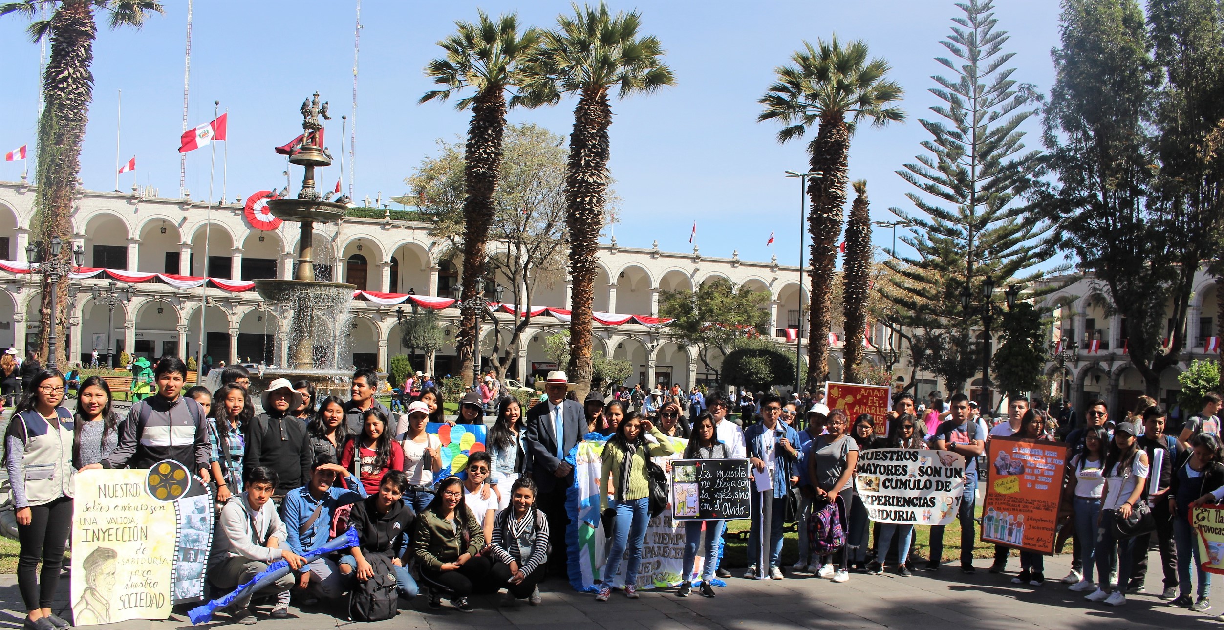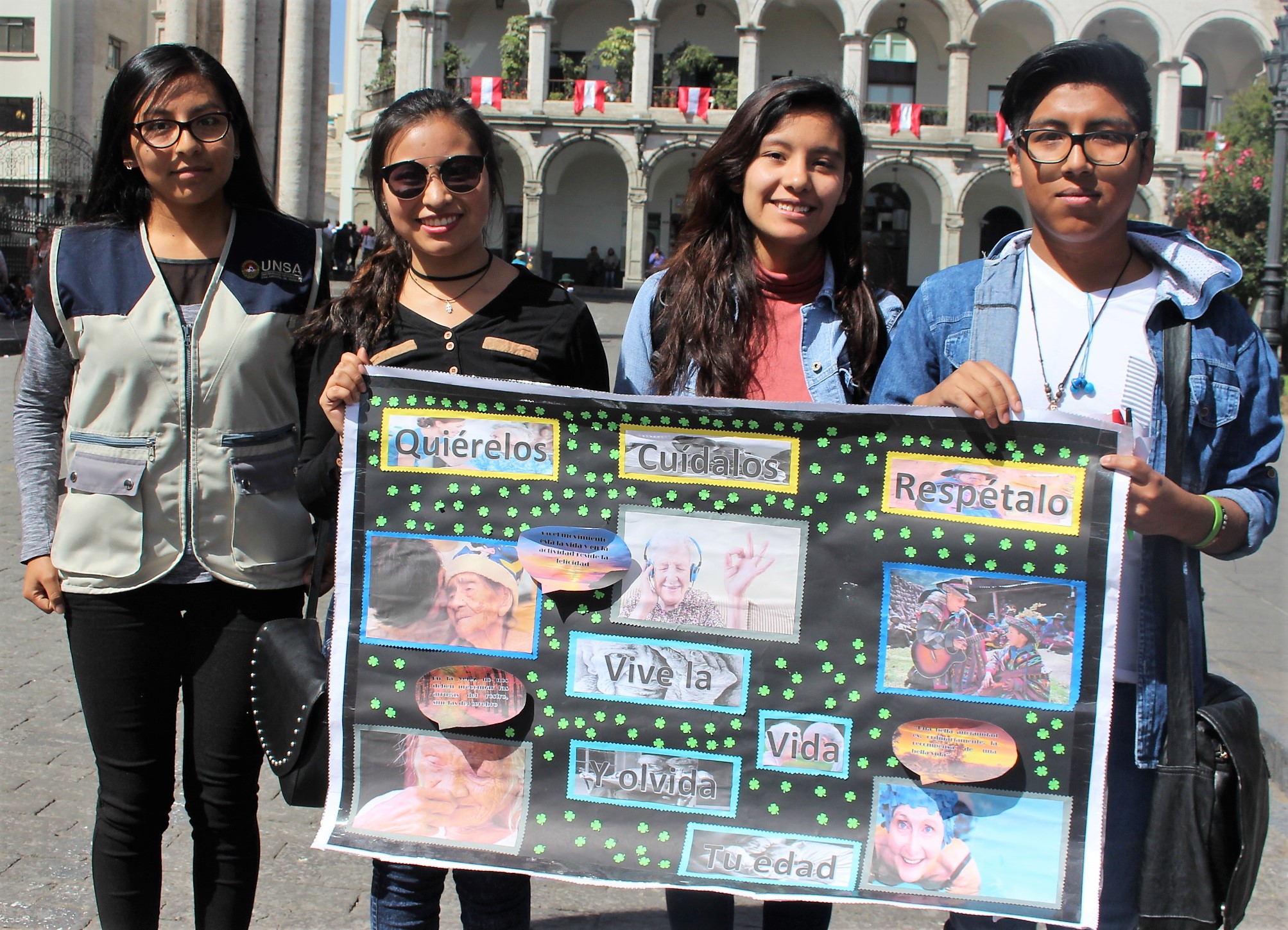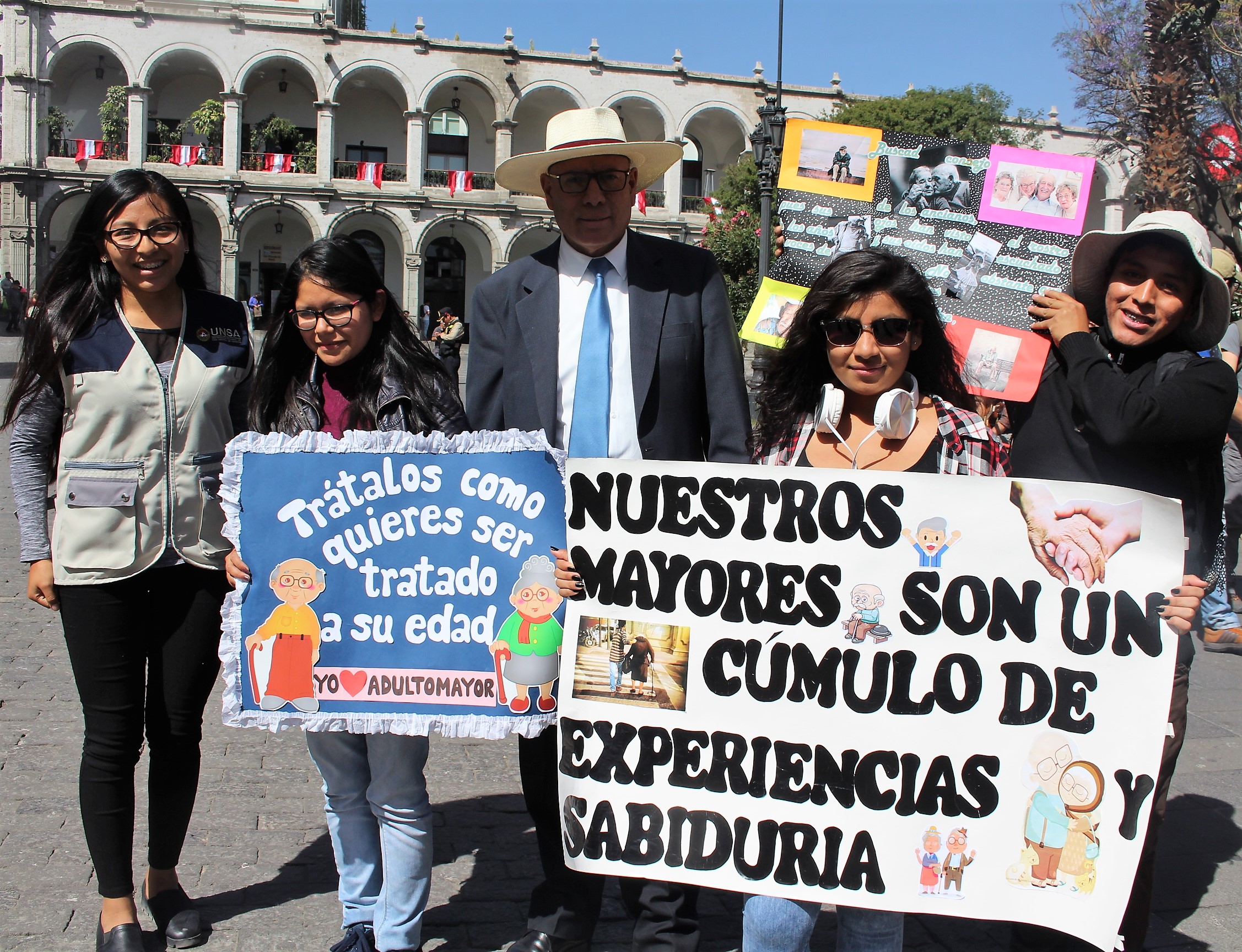 Detalló además que alrededor de 60 jóvenes estudiantes del segundo año de la Facultad de Derecho a su cargo recorrieron las principales calles de Arequipa desde tempranas horas, hasta llegar a la Plaza de Armas y al Rectorado con letreros y pancartas en mano con mensajes en defensa y protección de las personas de la tercera edad.