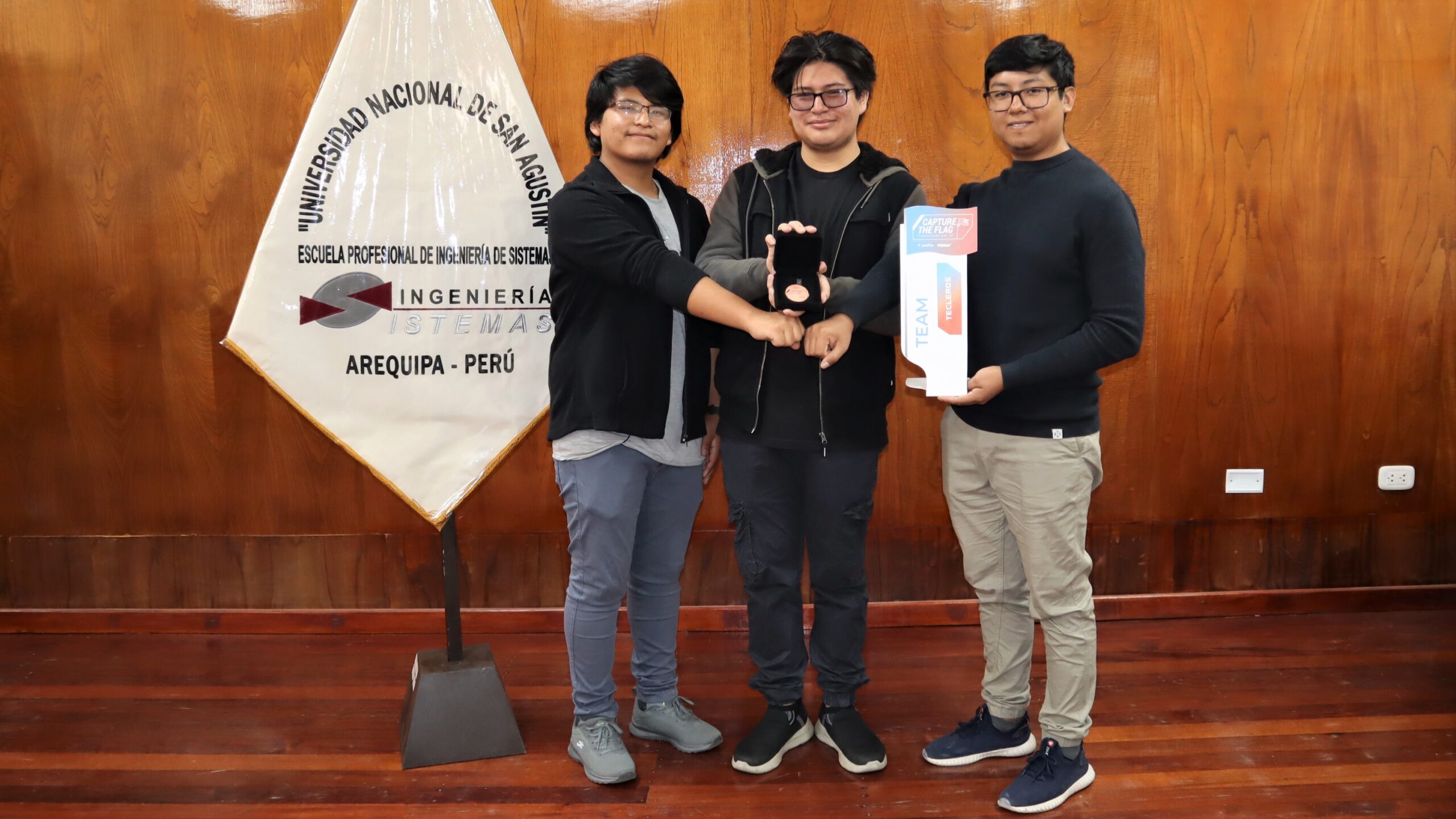 Gabriel Alberto Bernedo Kaseng, Iván Rodrigo Huayhua Mayta y Cristian Roberto Salhua Apfata, estudiantes de tercer y cuarto año de la Escuela Profesional de Ingeniería de Sistemas de la Universidad Nacional de San Agustín de Arequipa (UNSA), lograron el tercer puesto con un premio de mil soles en el concurso “Capture the Flag”, primer evento de ciberseguridad potenciado por inteligencia artificial que organizó Perú Pacífico Seguros y Prima AFP en la ciudad de Lima.